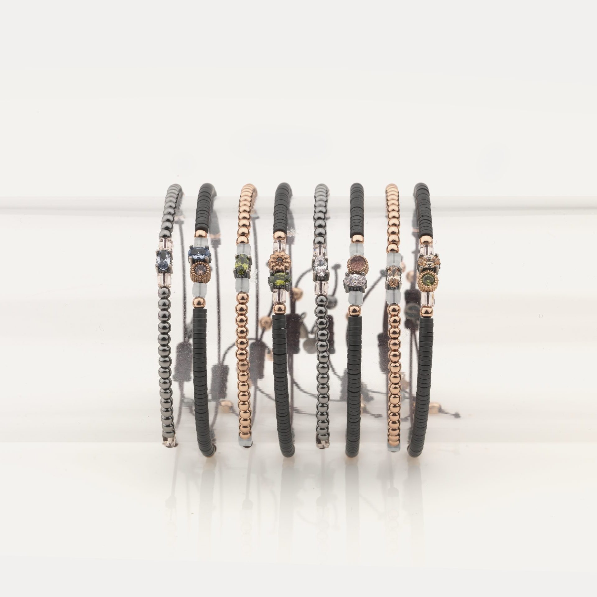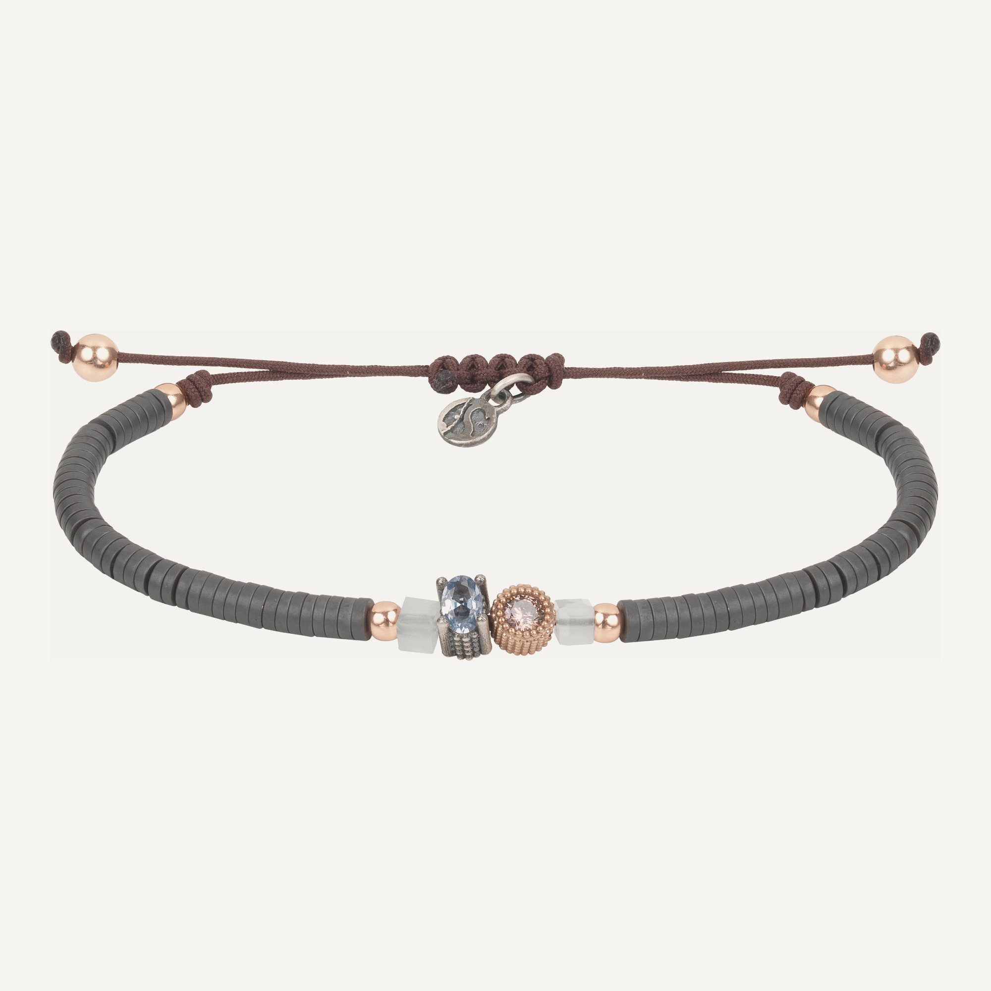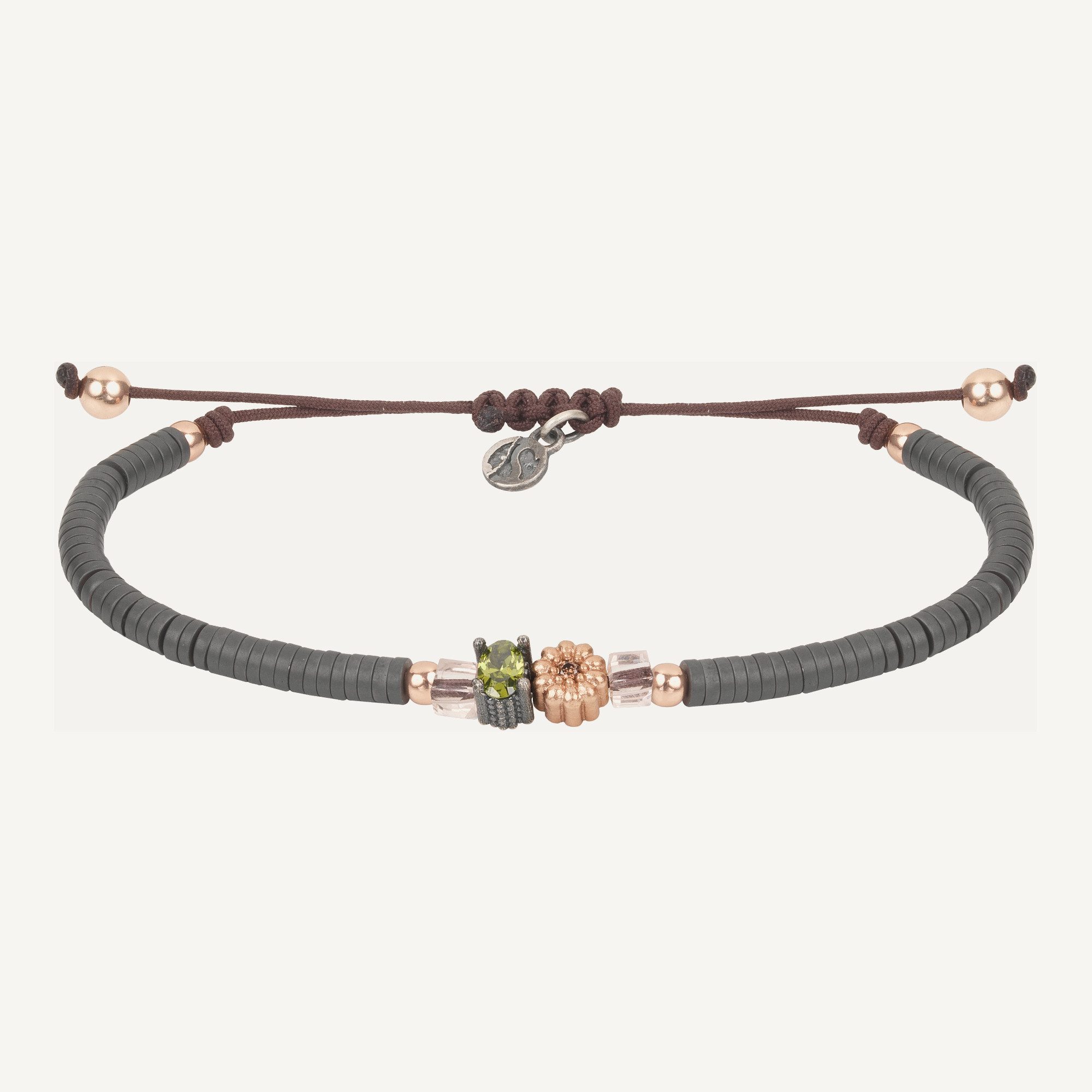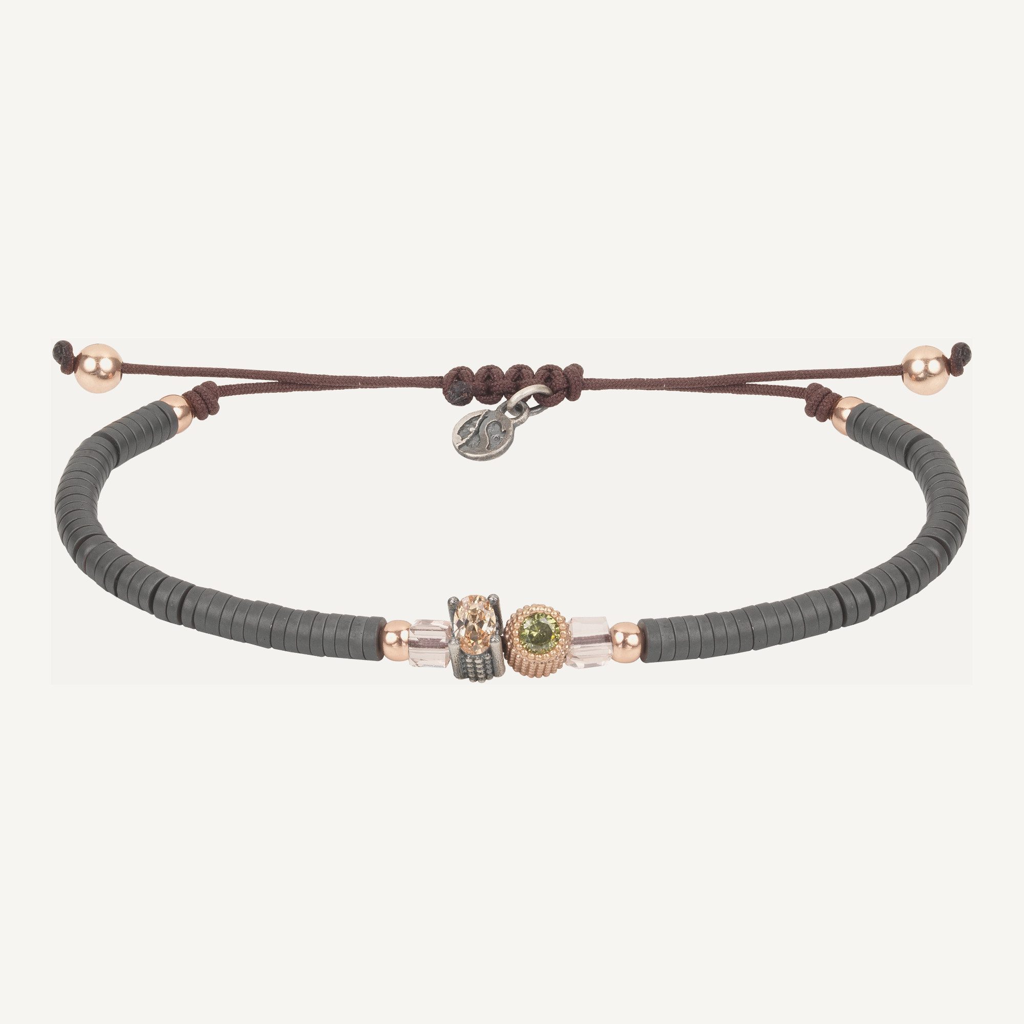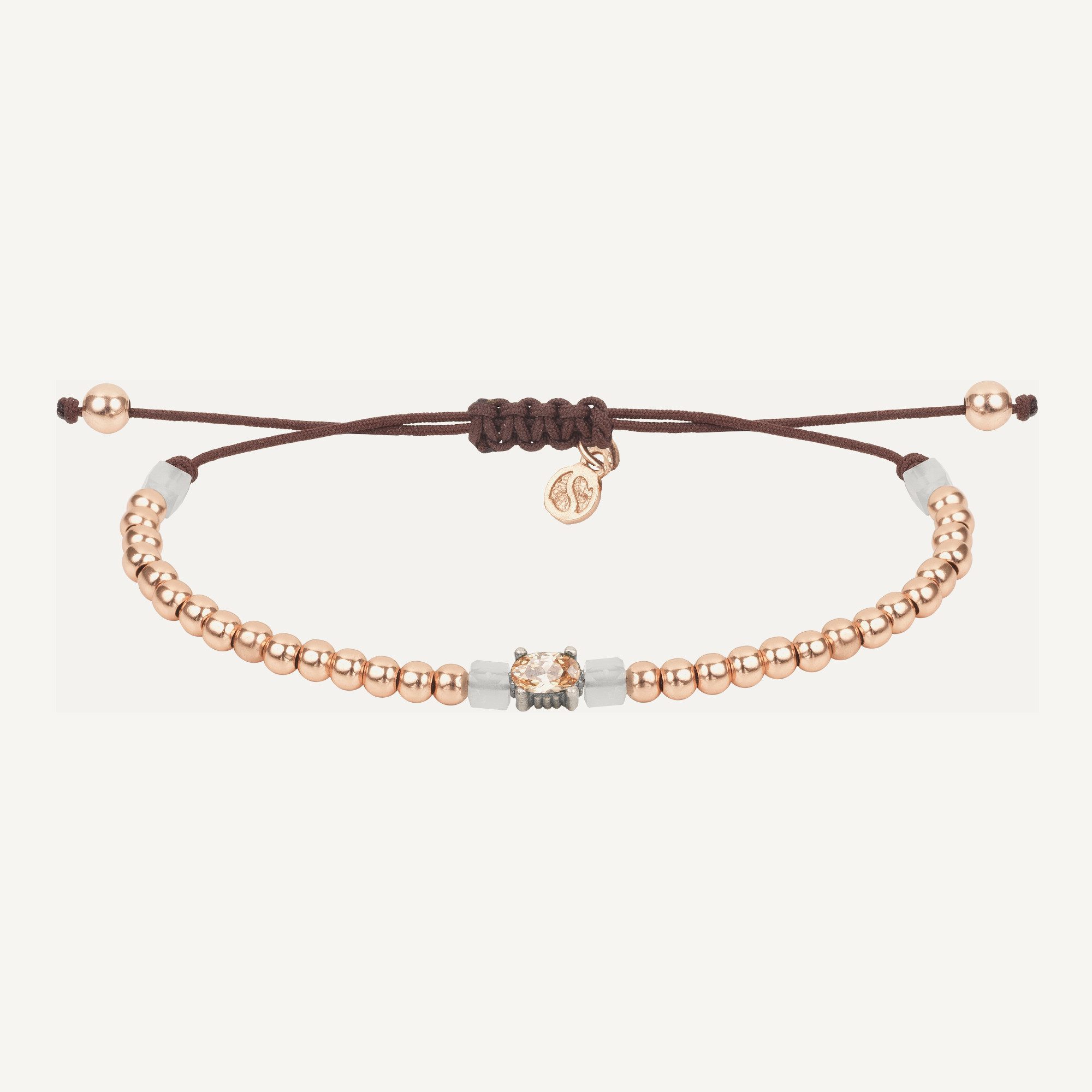 Pulsera de plata de ley con baño de oro rosa de 24 kt, circonitas, cuentas de cristal, hematites y nylon.