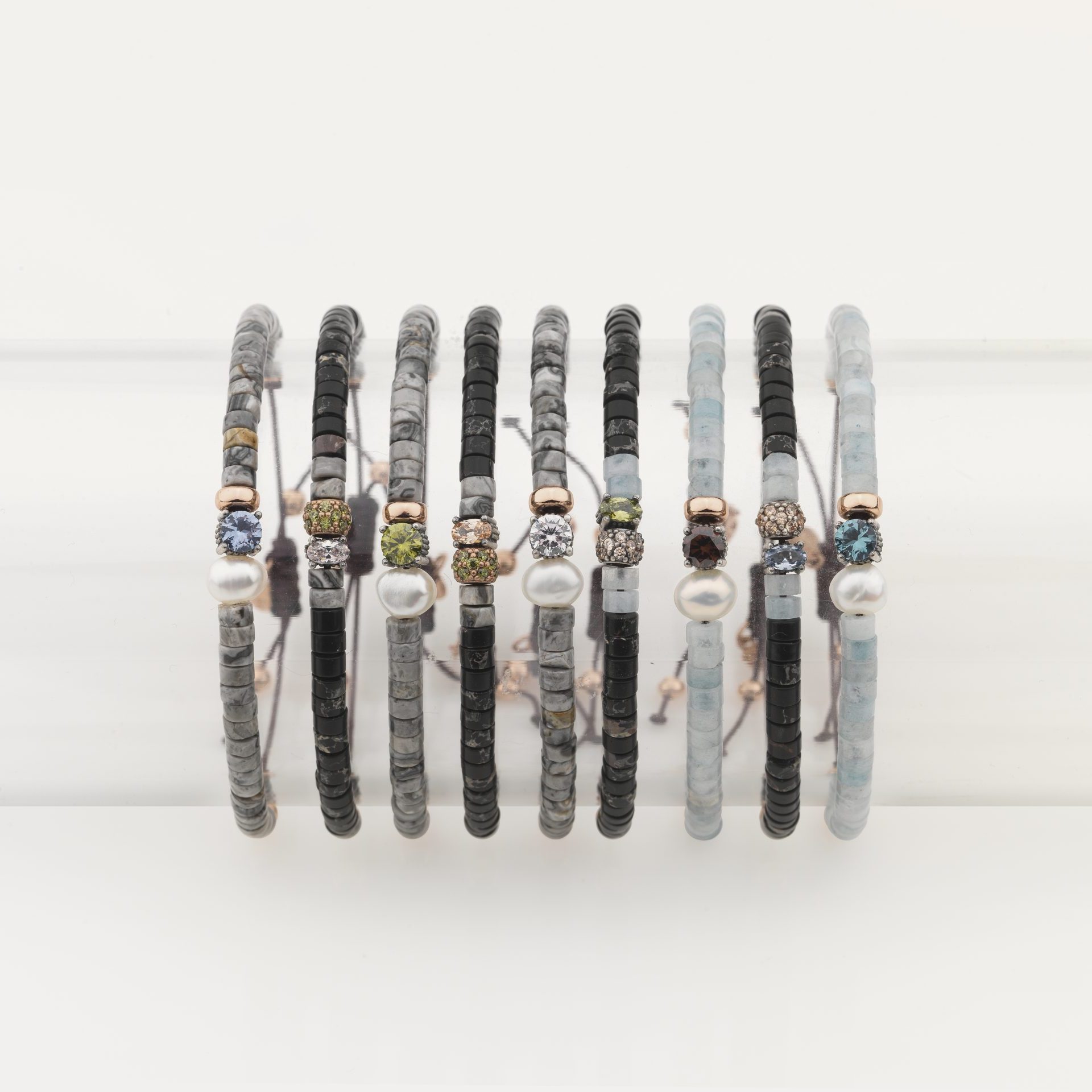 Pulsera de plata de ley 925, circonitas, cuentas de cristal, hematites y nylon.