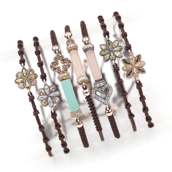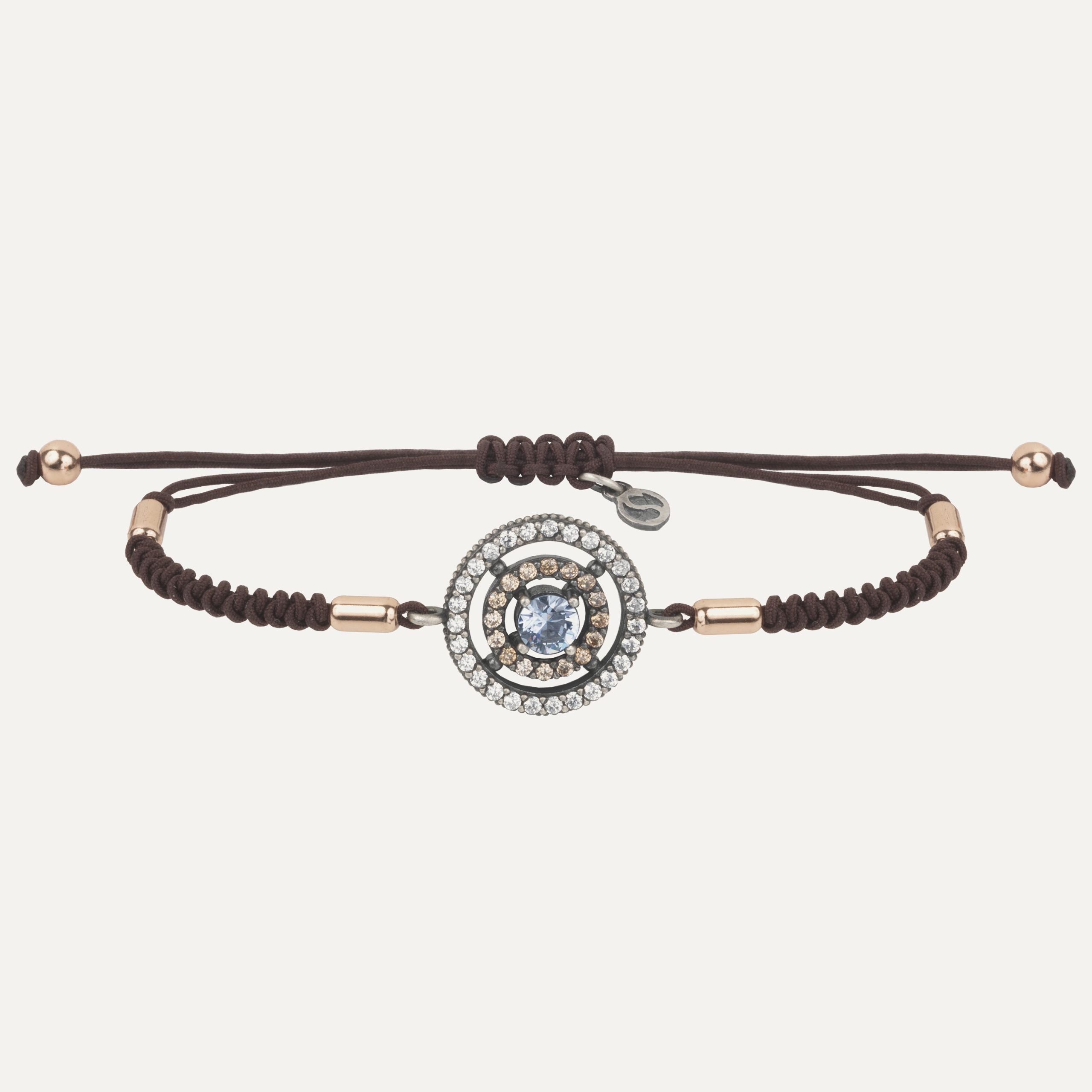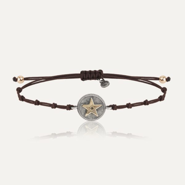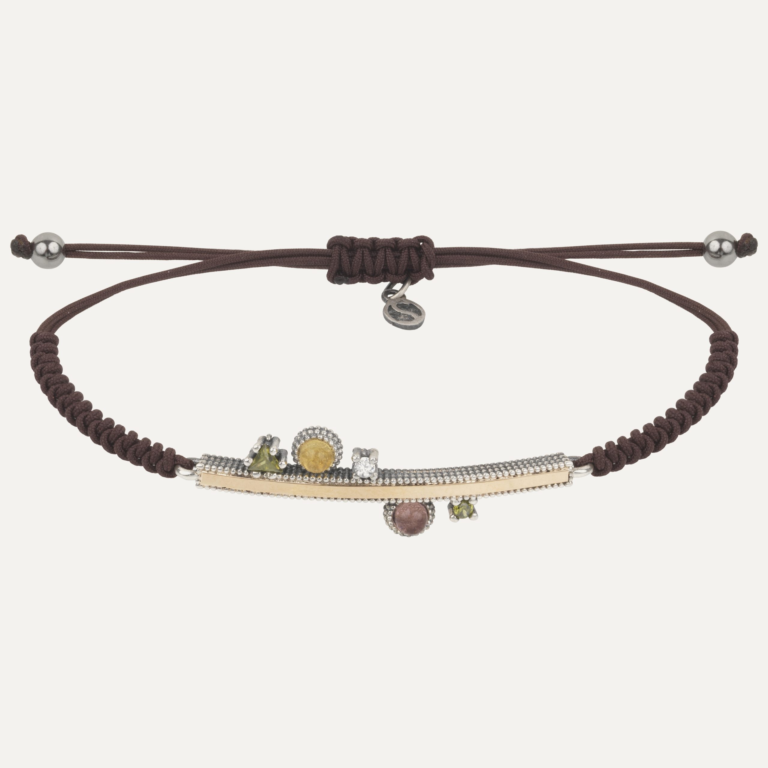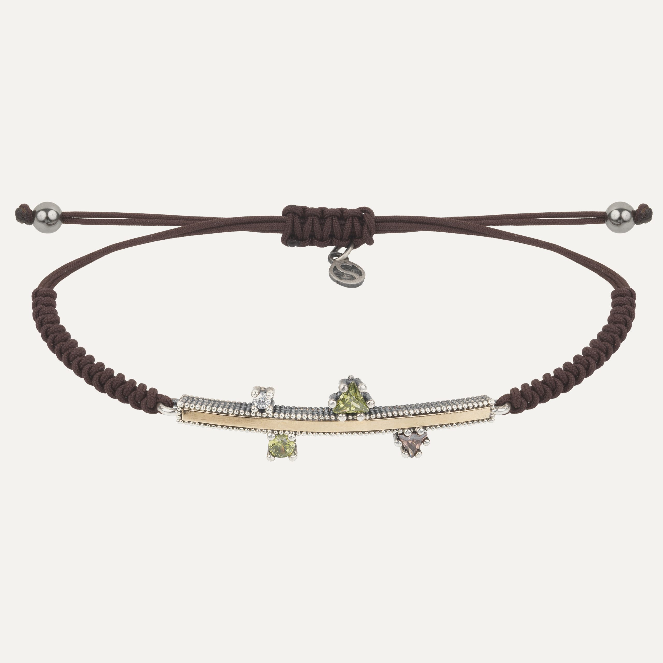 Pulsera de plata de ley 925 con acabado envejecido, oro de 9 kt, circonitas y nylon.