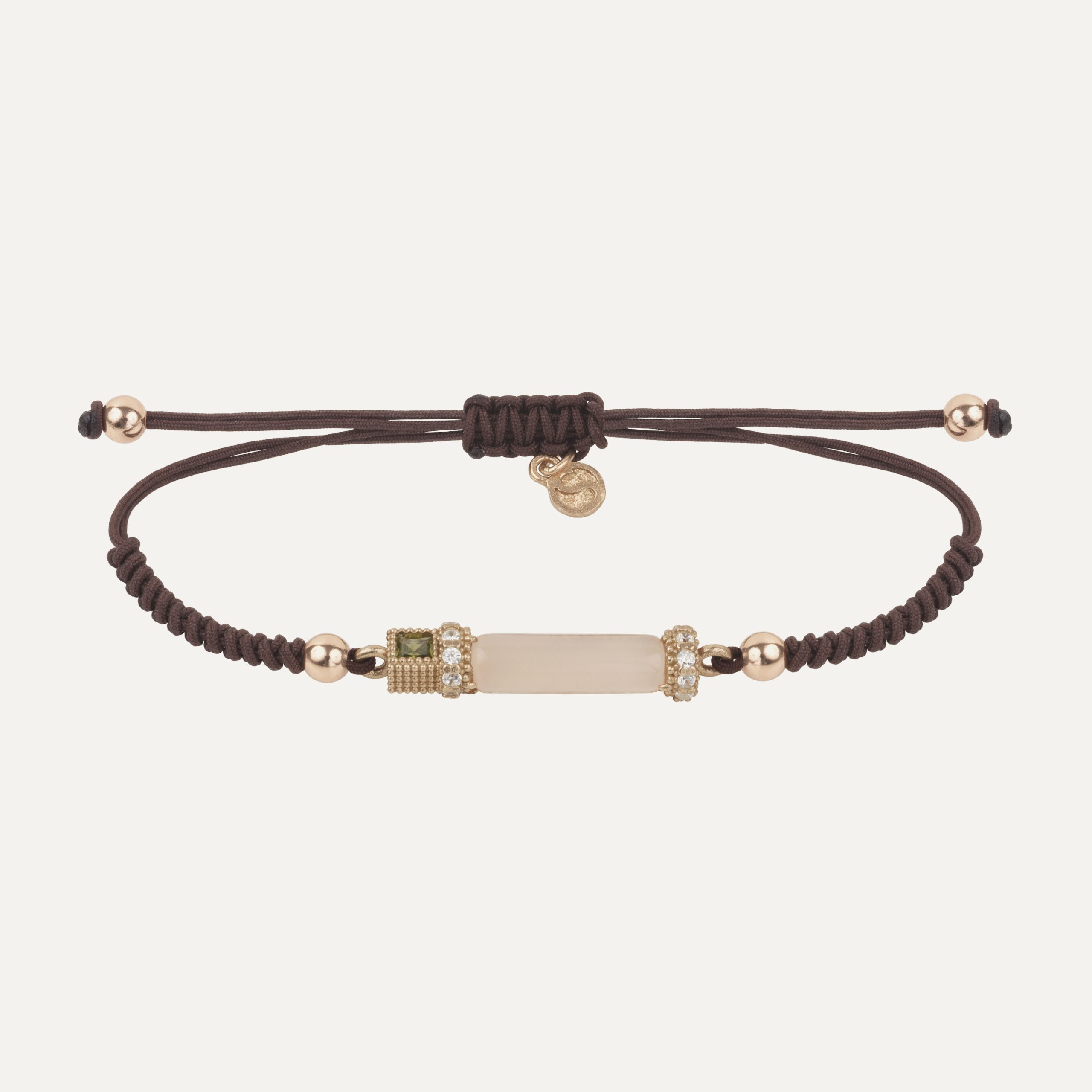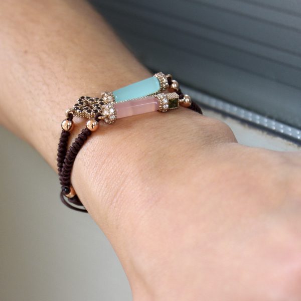 Pulsera de plata de ley 925 con baño de oro rosa de 24 kt, cuarzo rosa, circonitas y nylon.