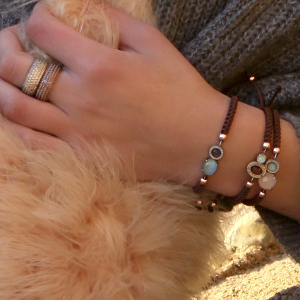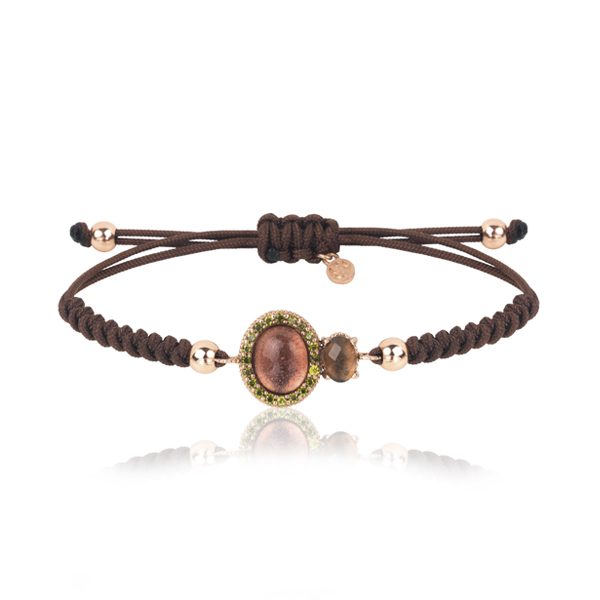 Pulsera de plata de ley 925 con cuarzo ahumado, circonitas verdes y cordón de nylon trenzado en color marrón.