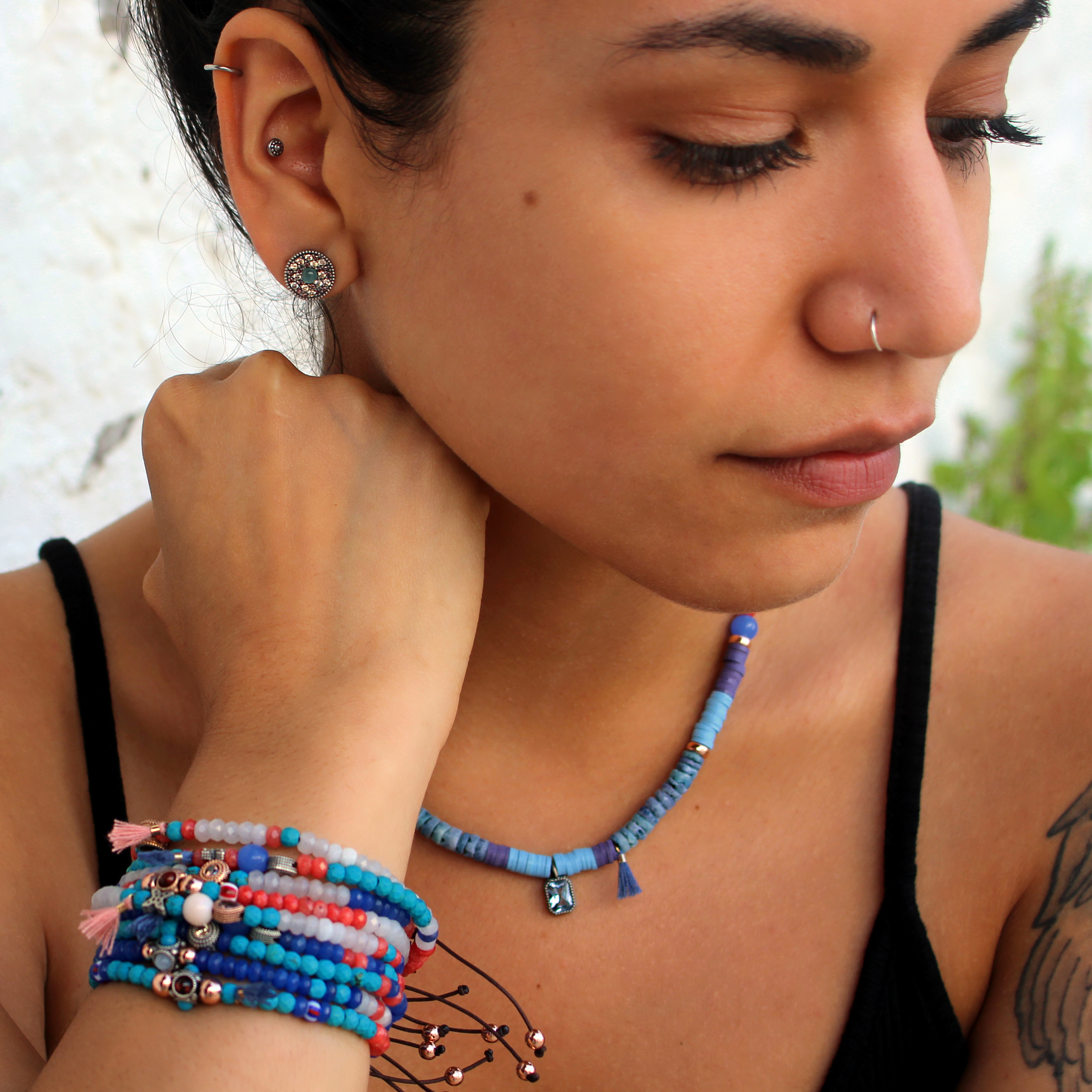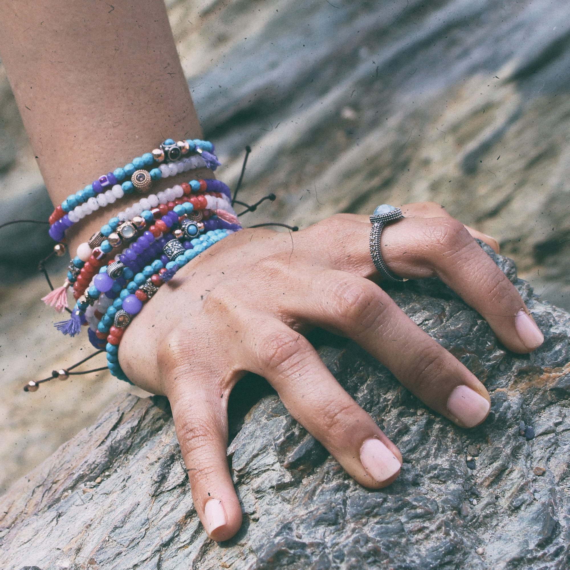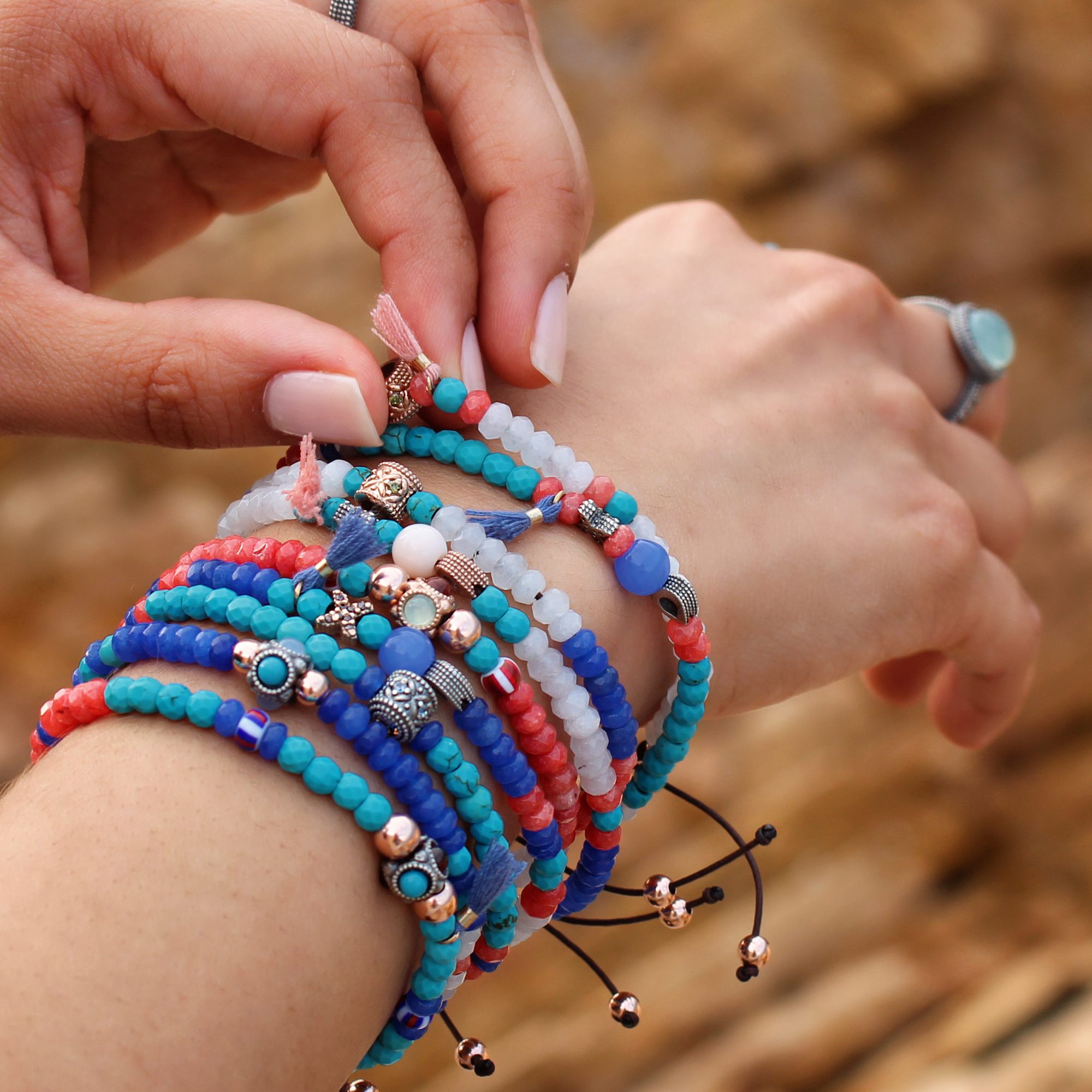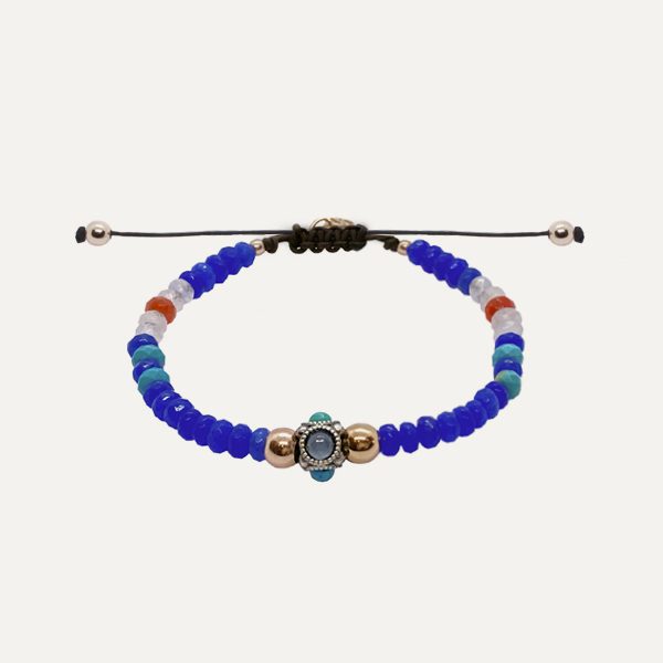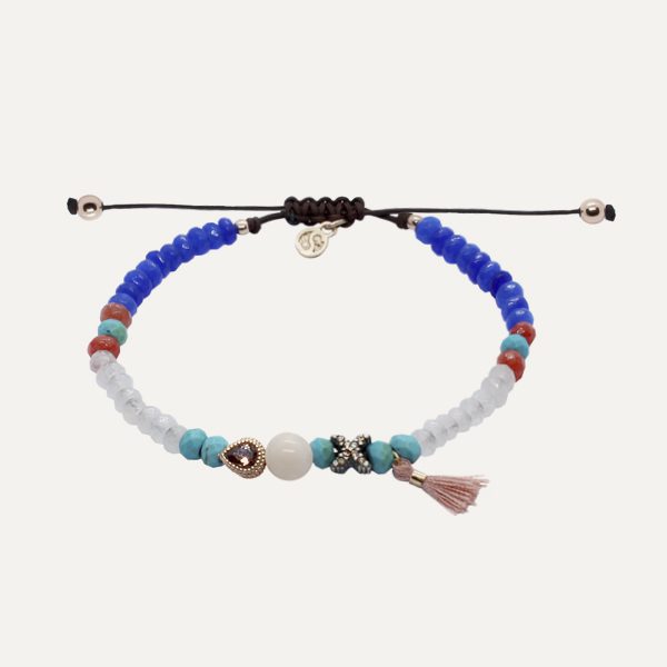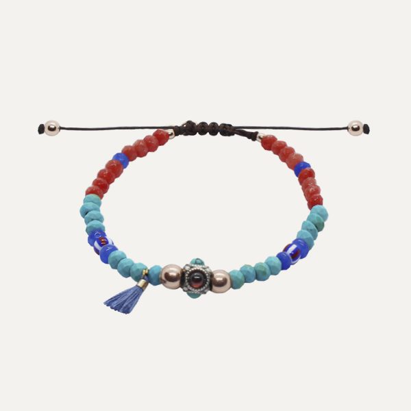 Pulsera de plata de ley, turquesas, granates, circonitas, cuentas de cristal y nylon.