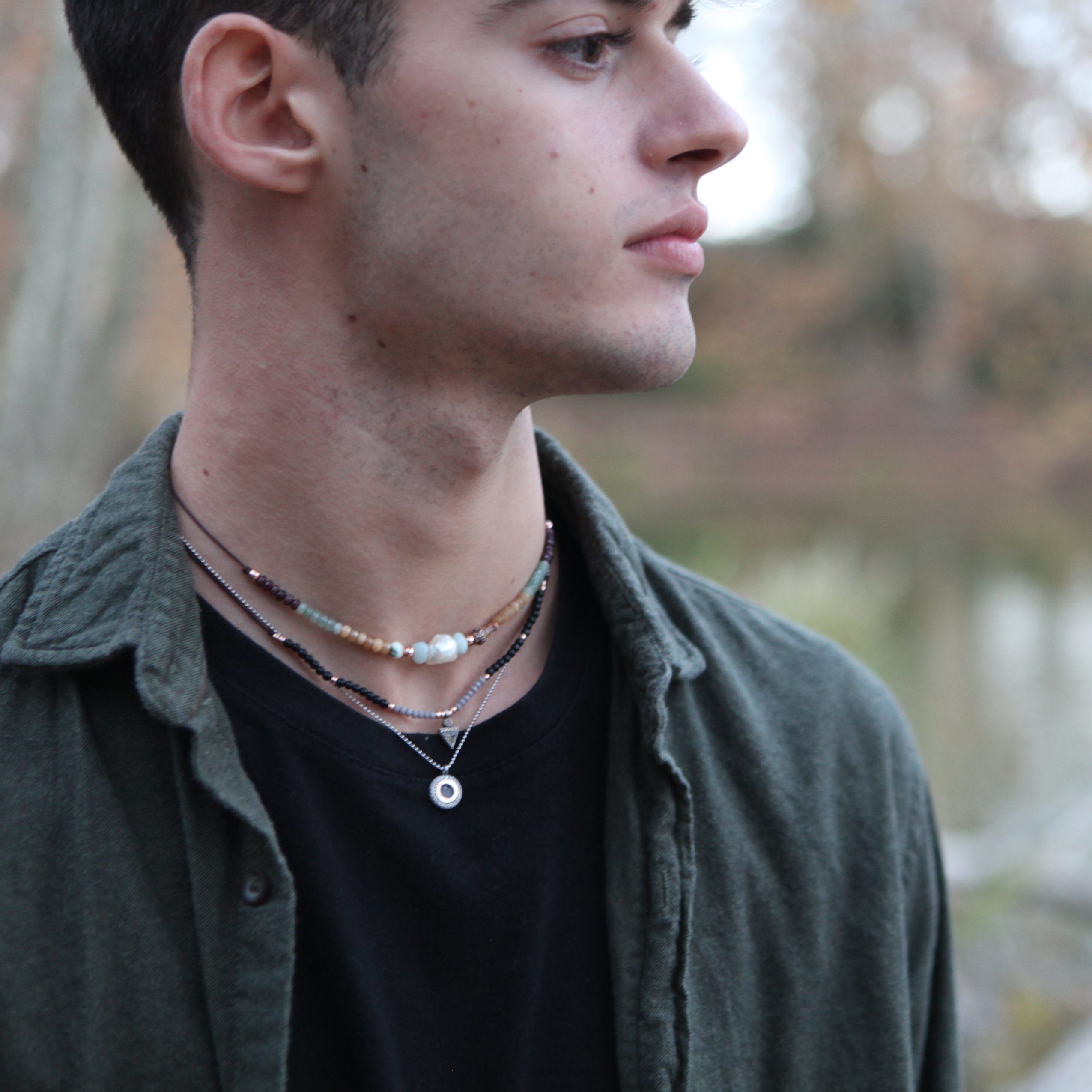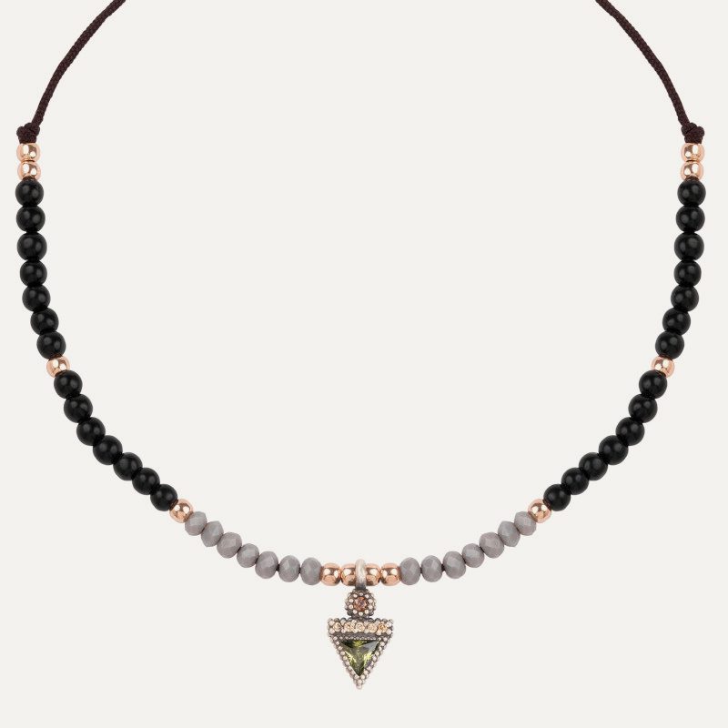 Colgante de plata de ley, ágatas, hematites, circonitas y nylon.