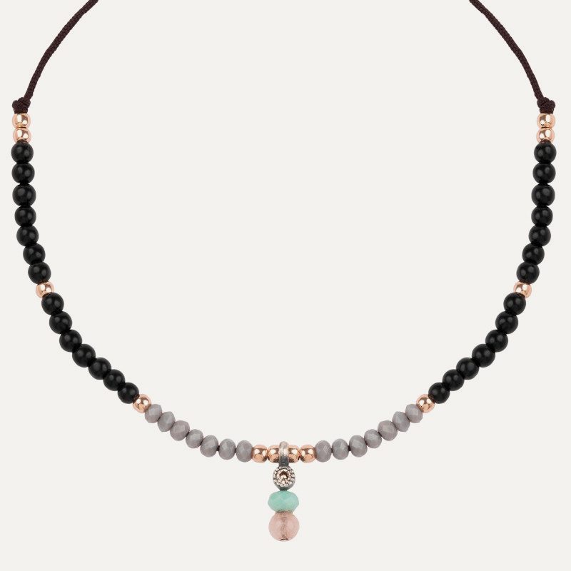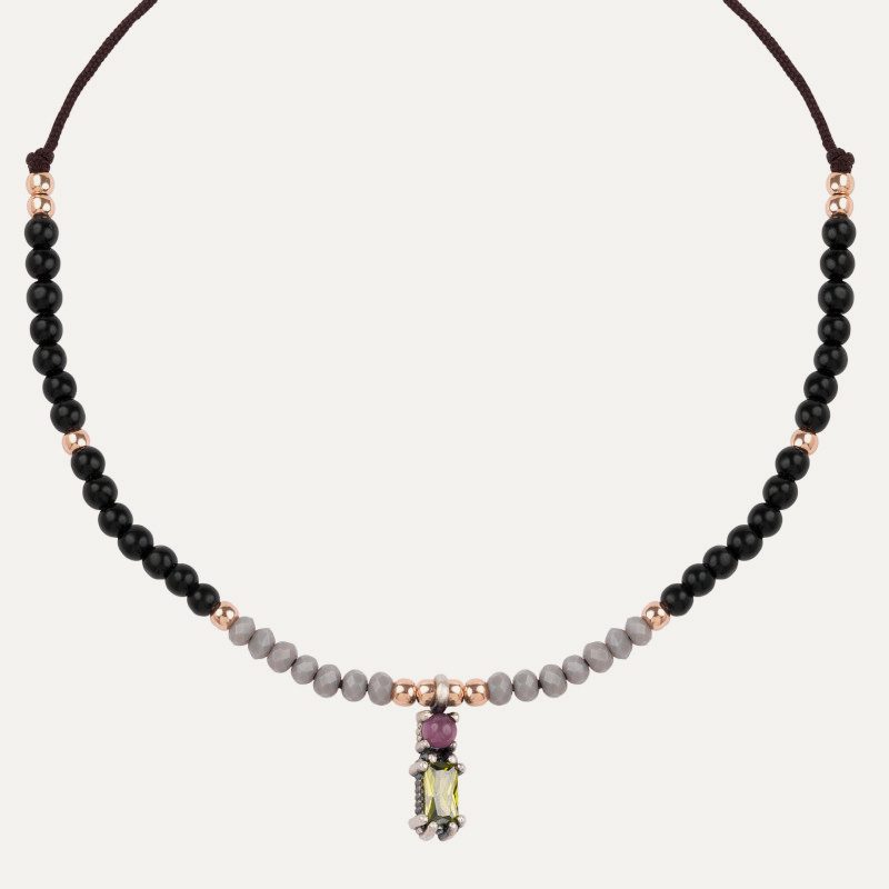 Colgante de plata de ley, cuarzo rosa, ágatas, hematites, circonitas y nylon.