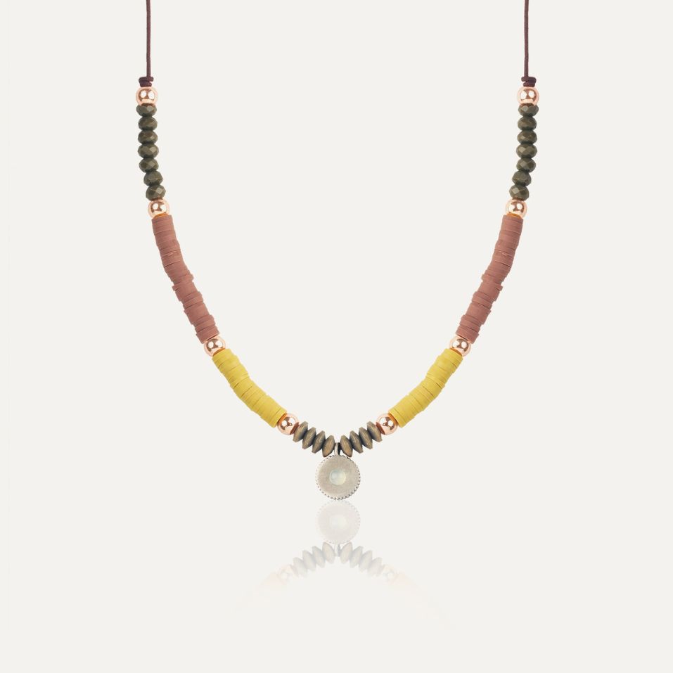Colgante de plata de ley, cuarzo en símil ópalo azul, ágatas, hematites, circonitas y nylon.