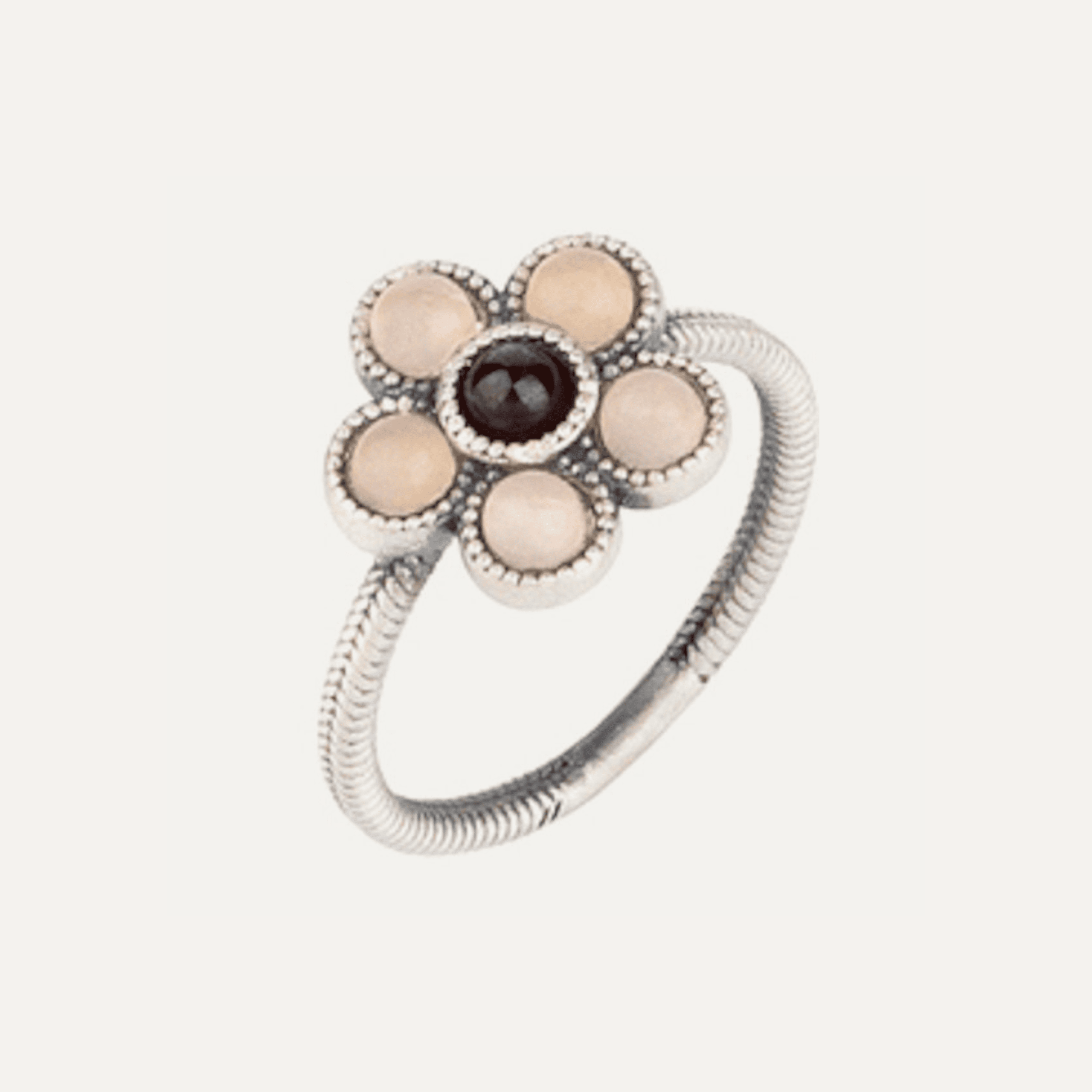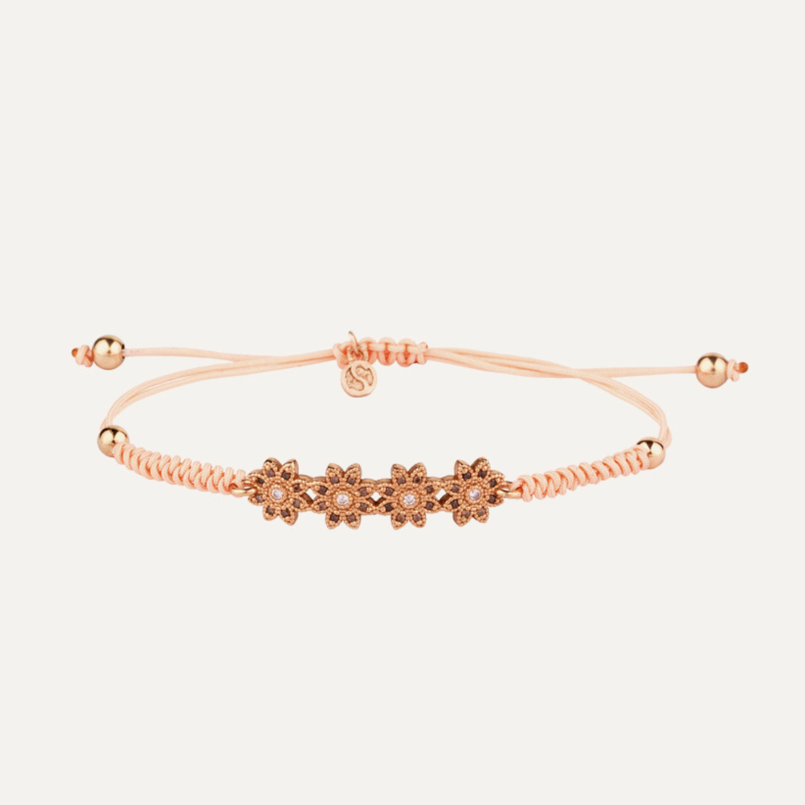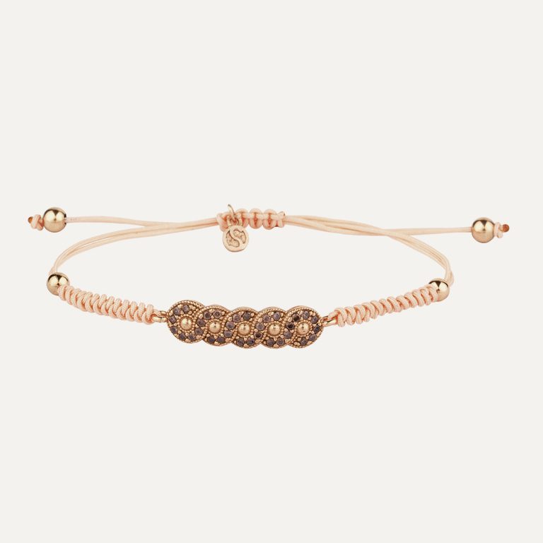 Pulsera ajustable de hilo nude con baño de oro rosa de 24 kt y detalle central de cinco círculos con circonitas fumé.