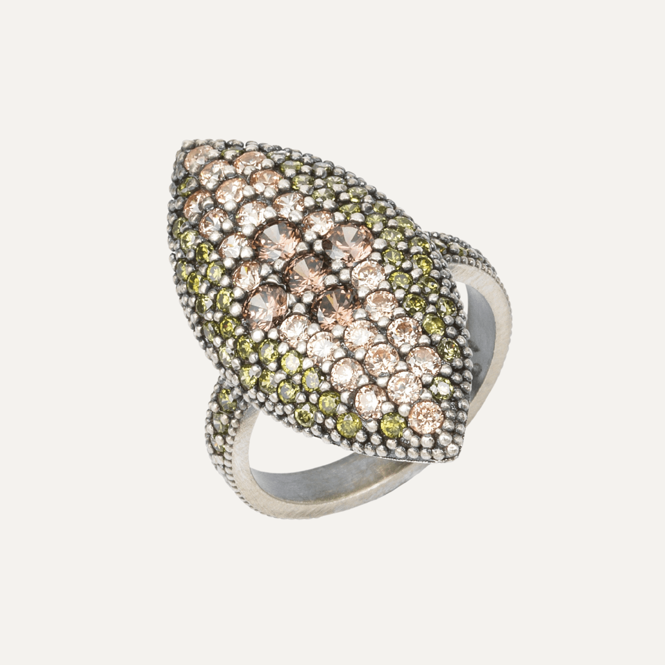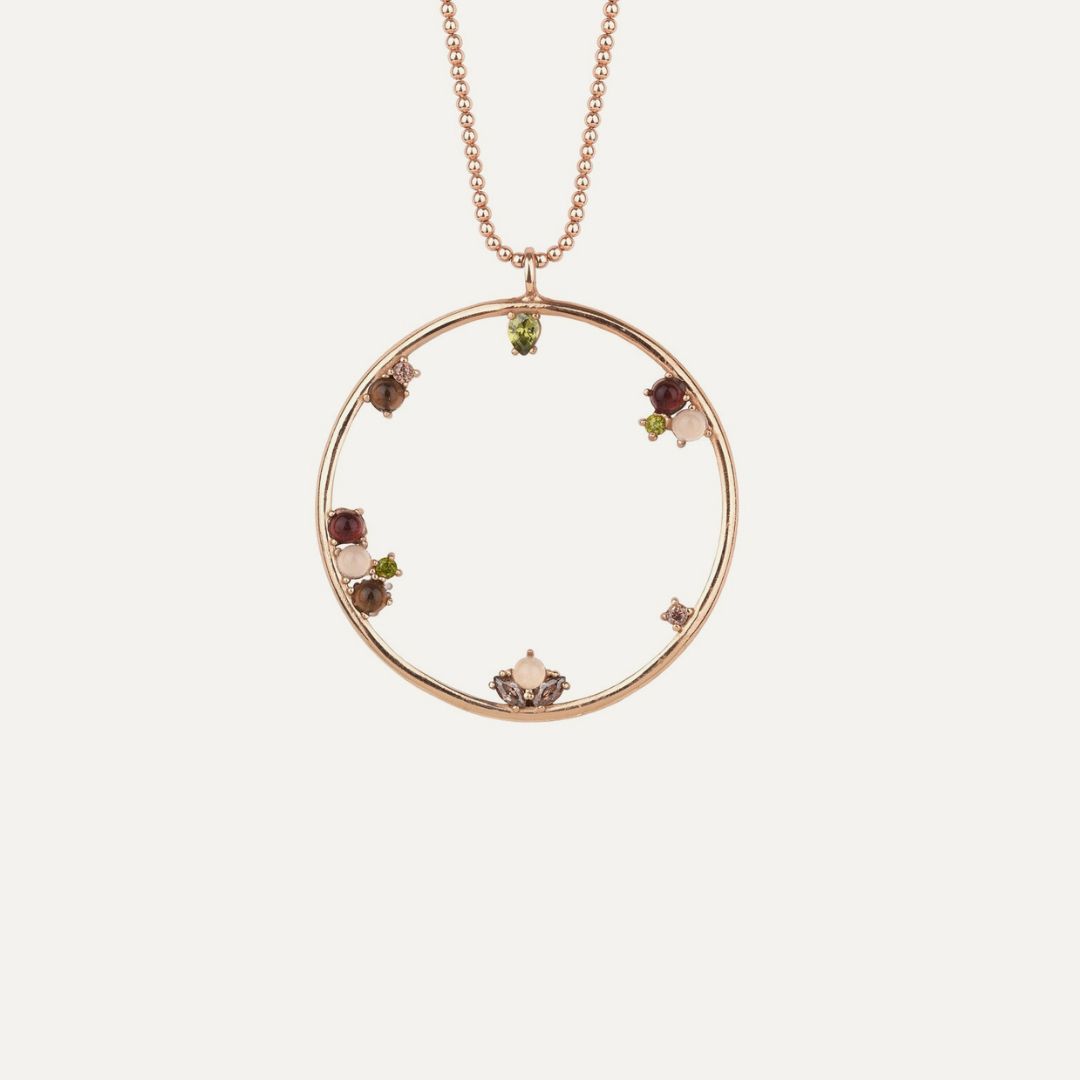 Colgante de plata de ley 925 con baño de oro rosa de 24 kt, decorado con granate, peridoto, cuarzo fumé y cuarzo rosa. Un diseño circular de inspir...