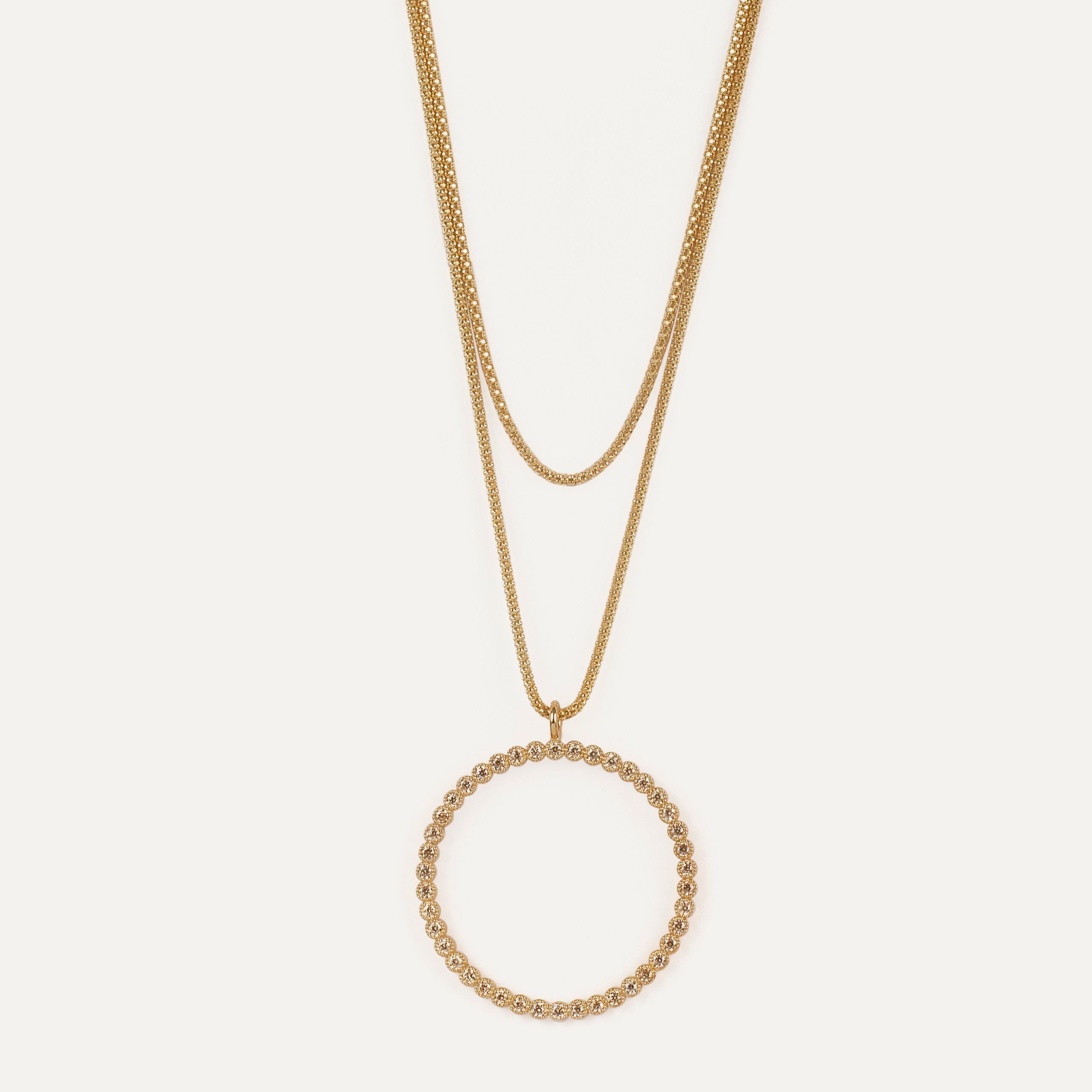 Collar de plata de ley 925 con baño de oro amarillo de 24 kt, cadena doble y colgante circular con halo de circonitas blancas.