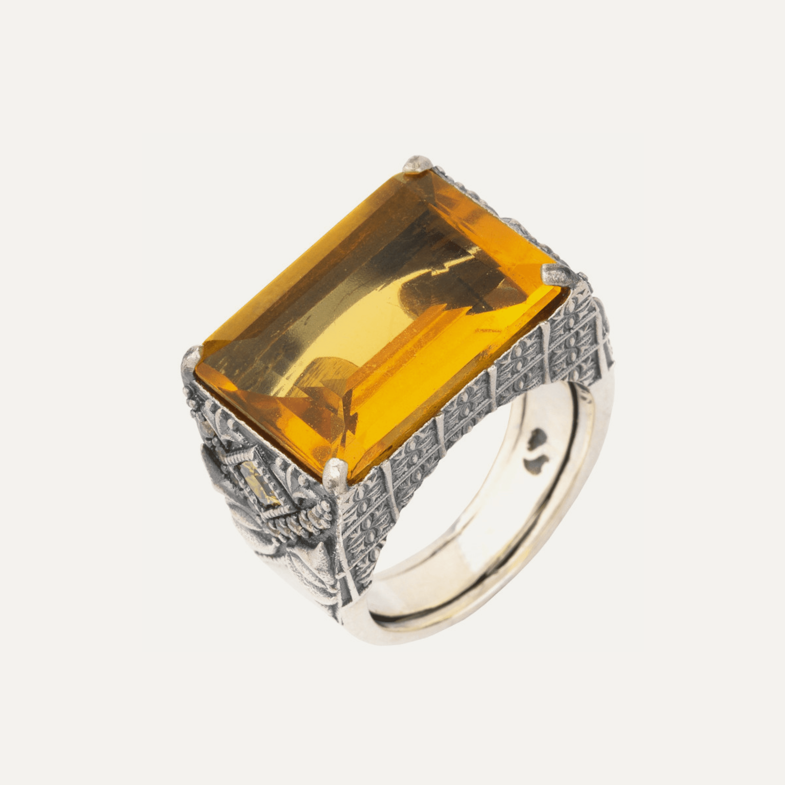 Anillo de plata de ley 925 con acabado envejecido y circonitas cava engastadas en un delicado patrón calado.