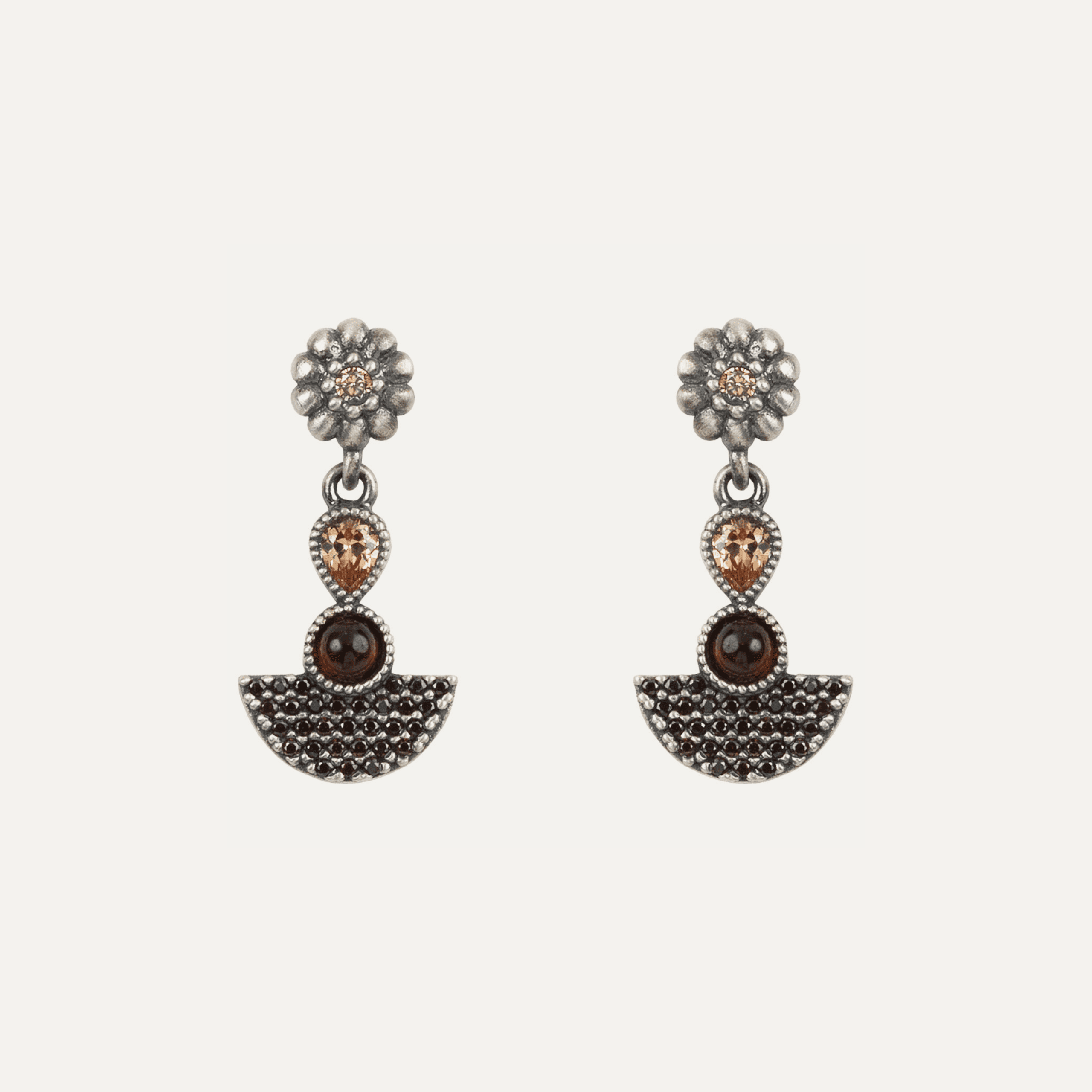 Pendientes de plata de ley 925 con cabujón de turmalina facetada, halo de circonitas rosadas y cuarzo marrón fumé ovalado.