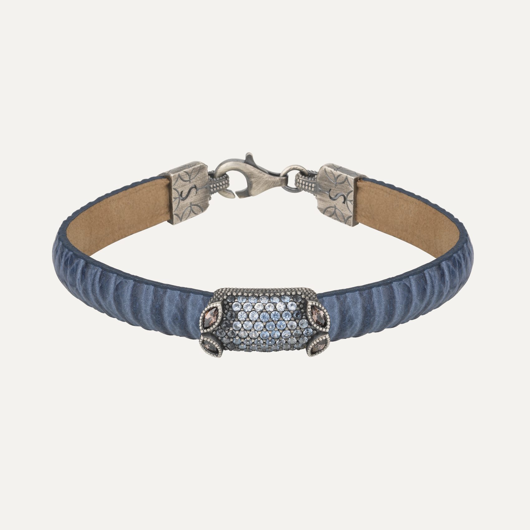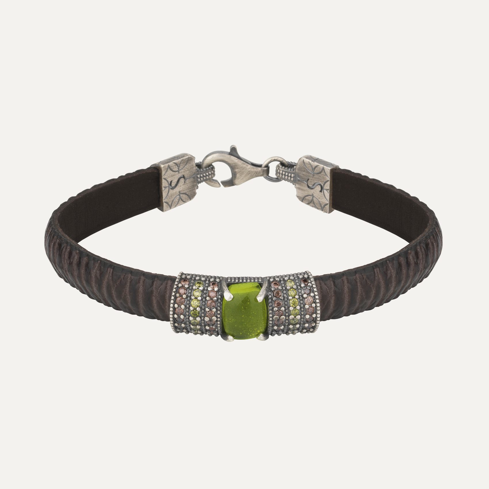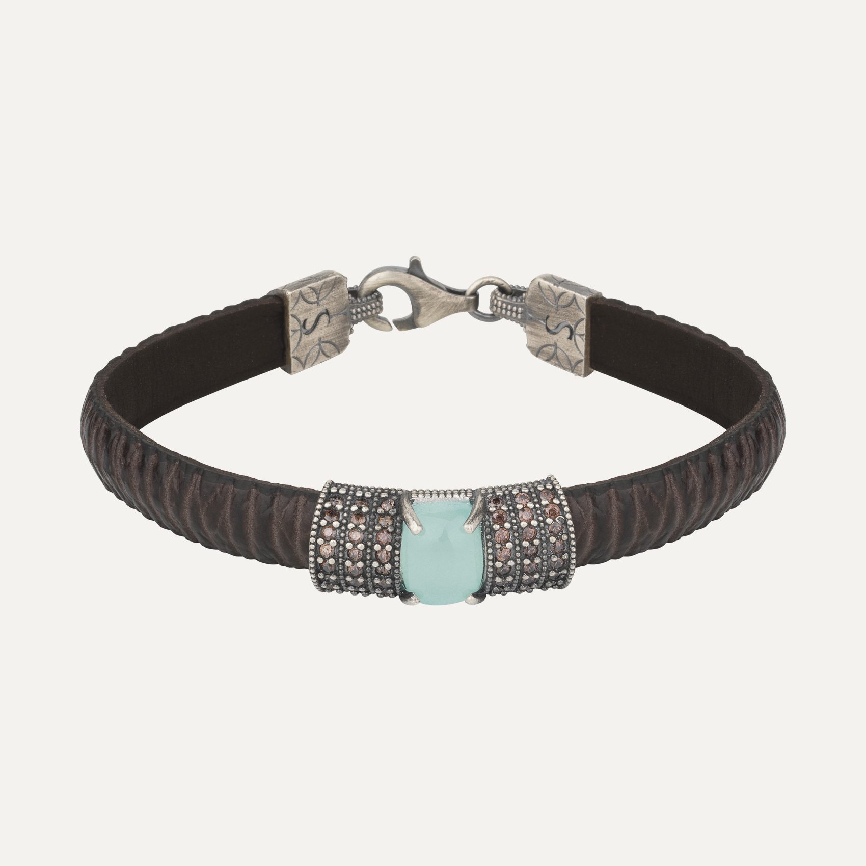 Pulsera de plata de ley, cuarzo, circonitas y cuero, en dos colores a elegir.