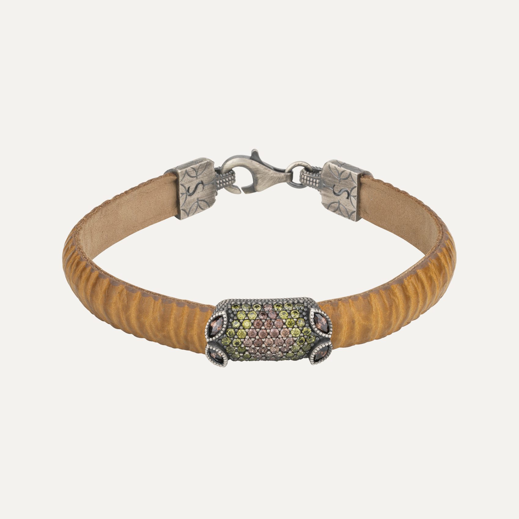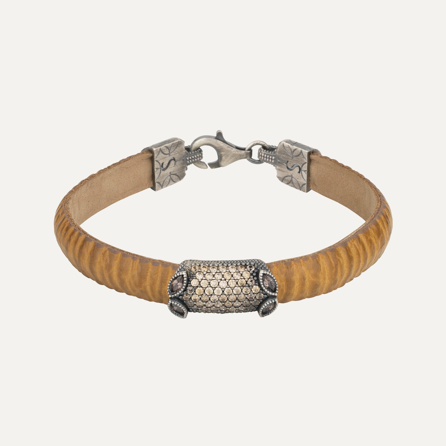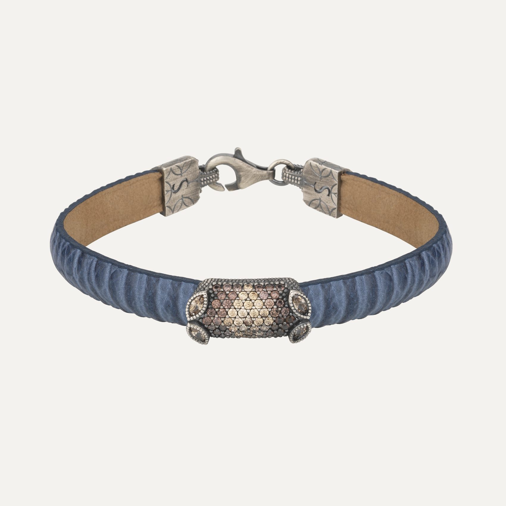 Pulsera de plata de ley, cuarzo, circonitas y cuero, en dos colores a elegir.