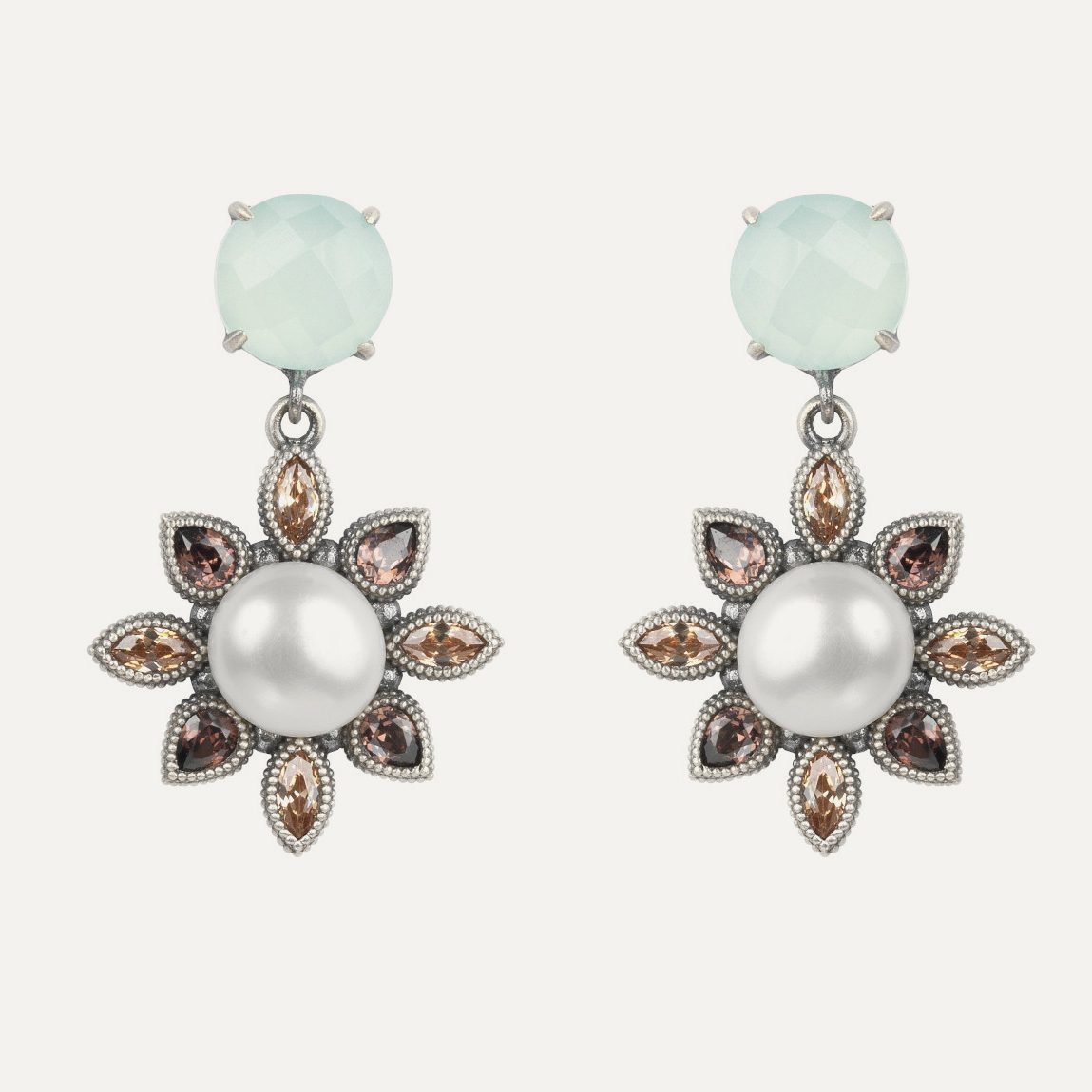 Pendientes de plata de ley 925 con acabado envejecido, perla barroca, calcedonia y circonitas.