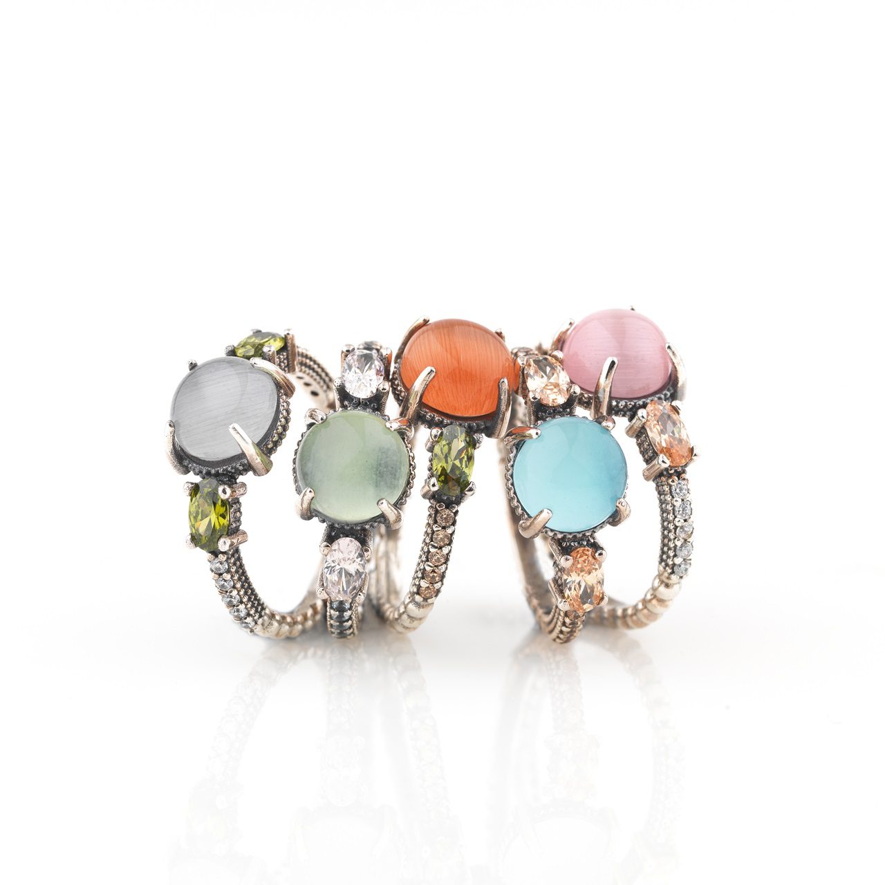 Anillo de plata oxidada 925 con acabado envejecido y circonitas en cinco combinaciones de colores a elegir.