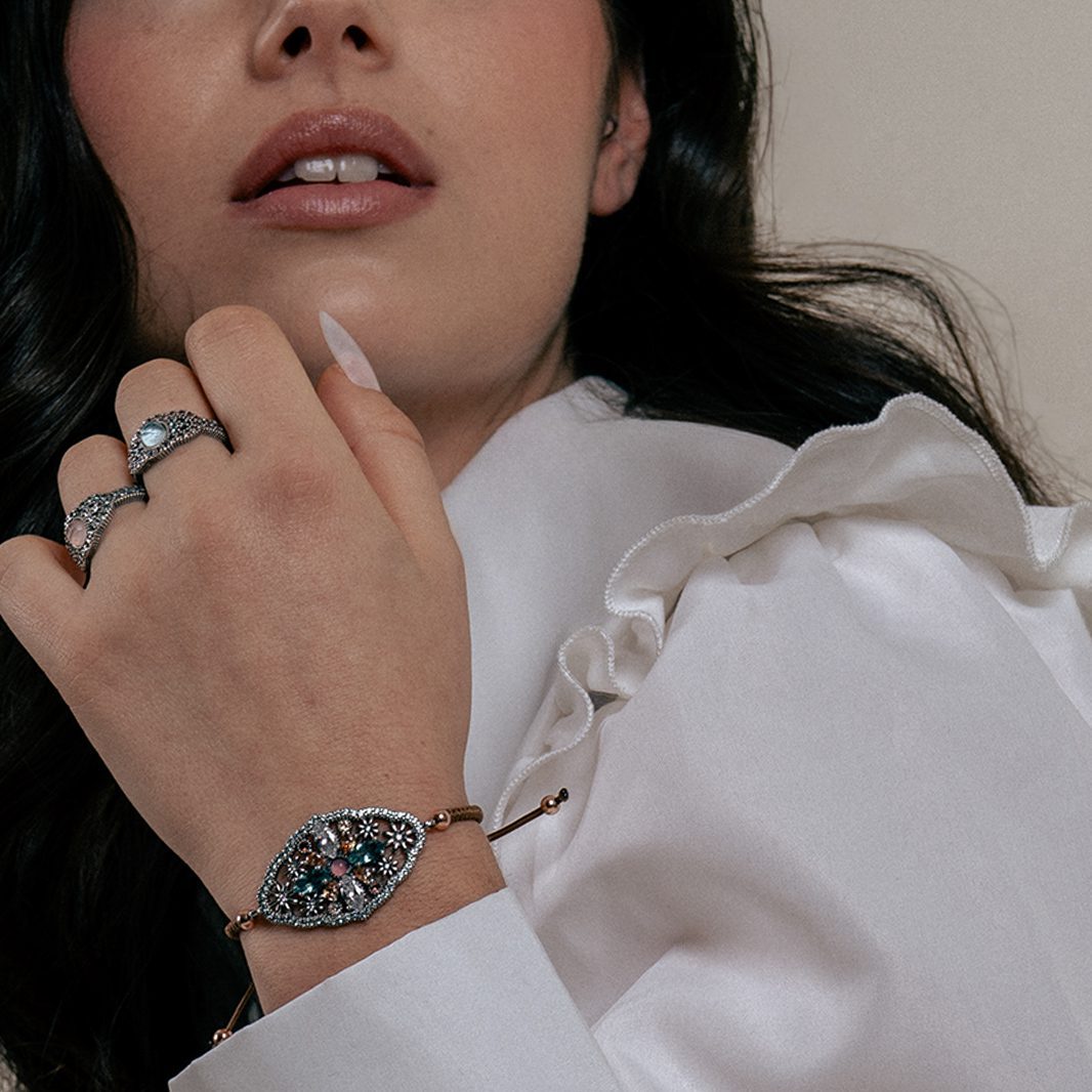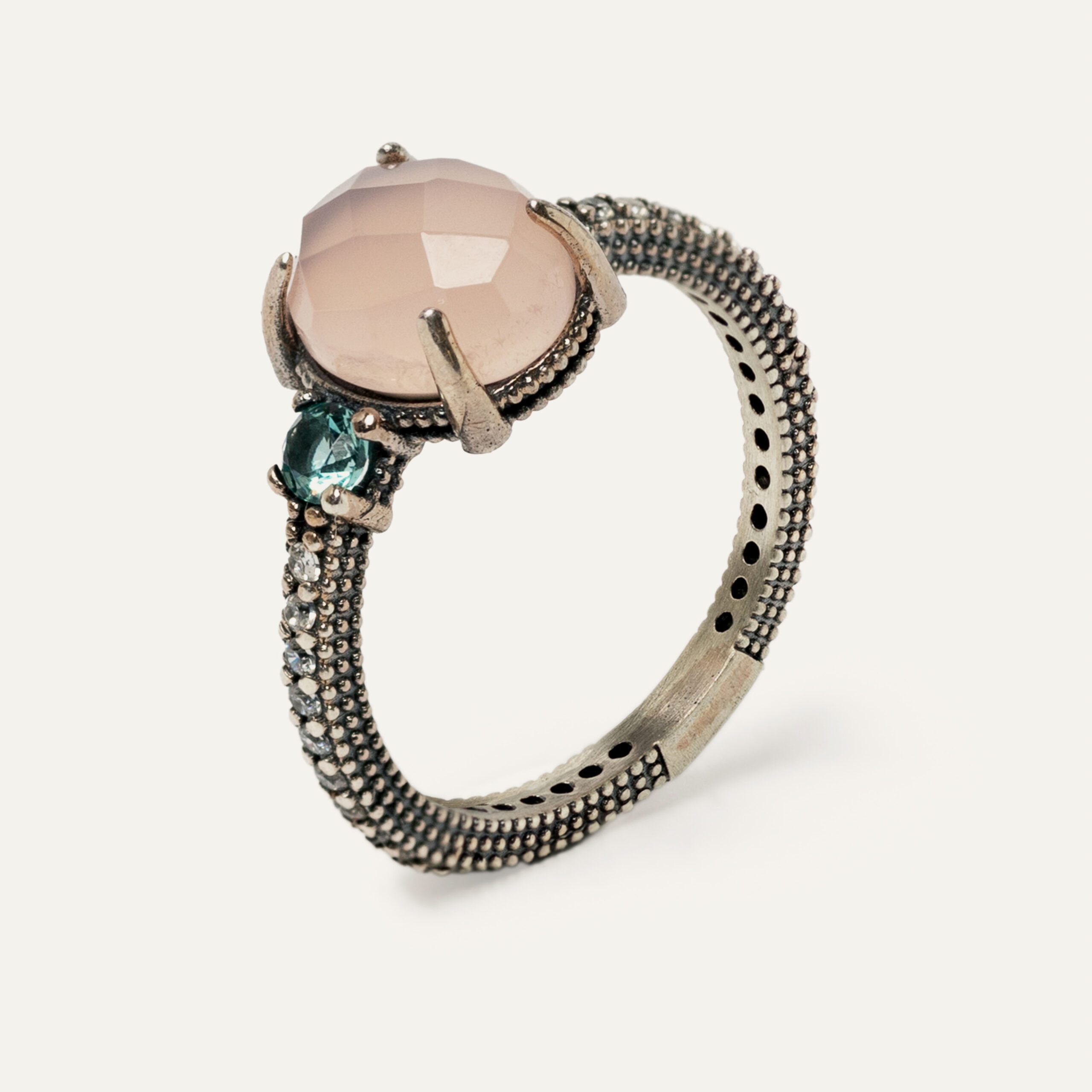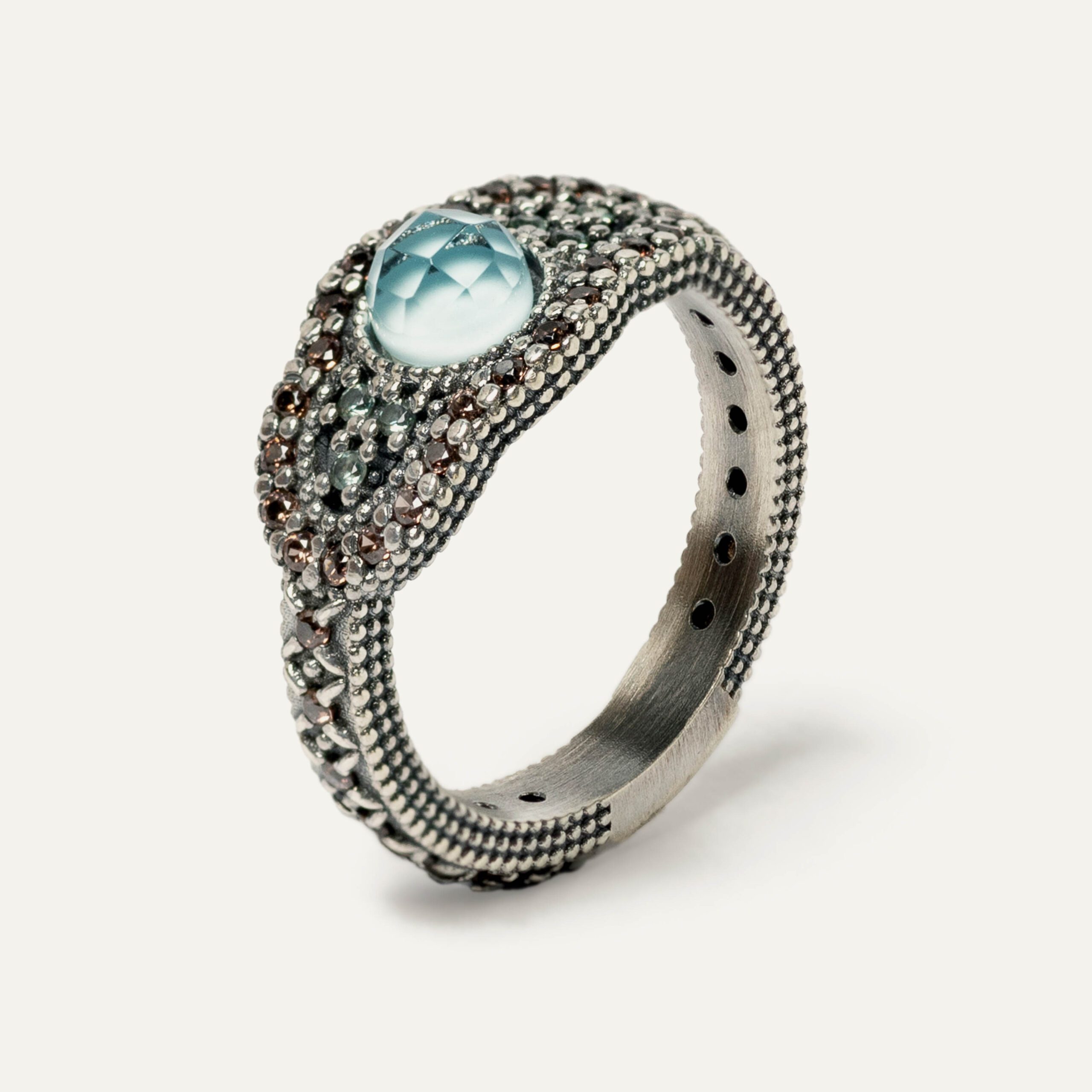 Anillo de plata de ley 925 en tres combinaciones de colores y dos posibles acabados a elegir: baño de oro rosa de 24 kt o plata envejecida.