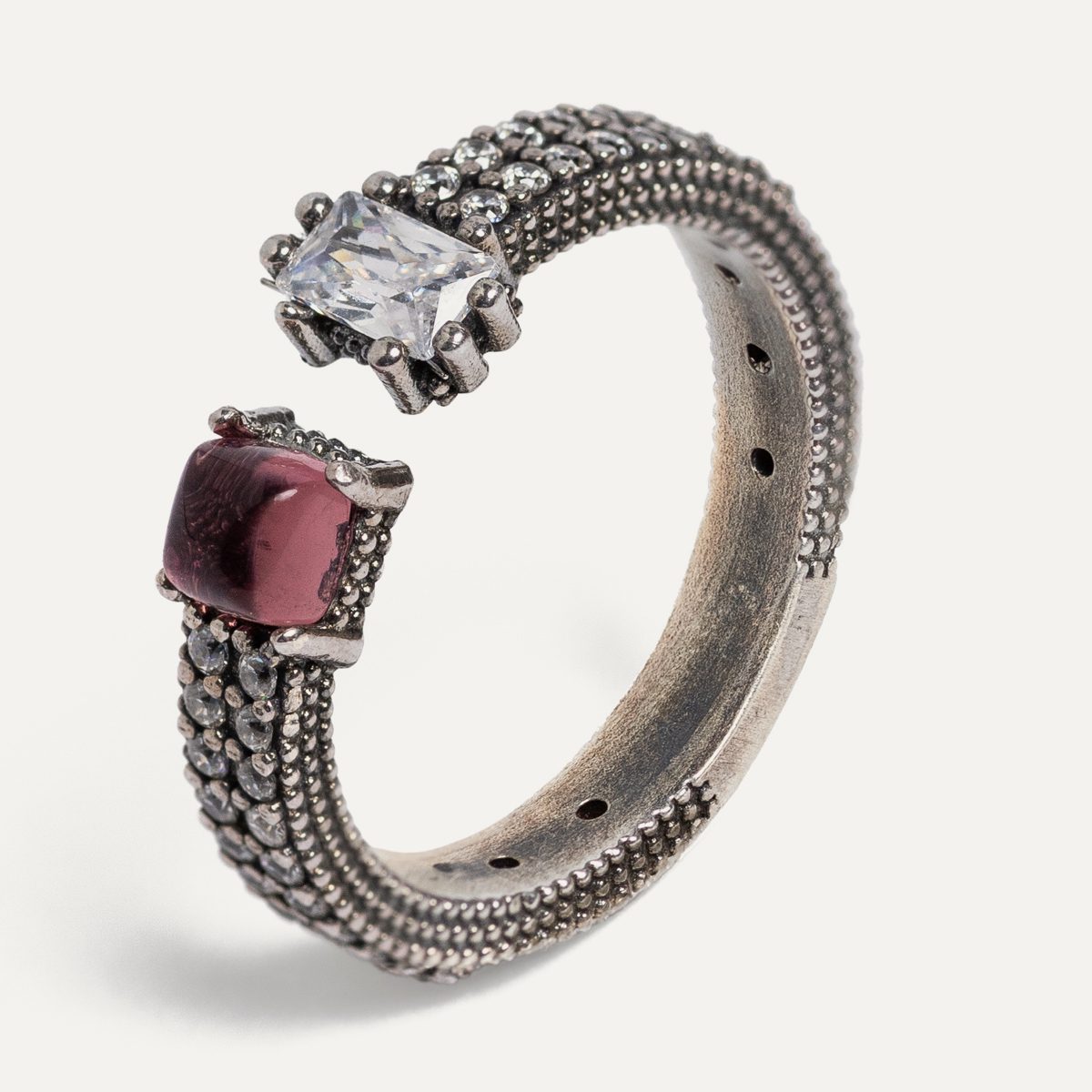 Anillo de plata de ley 925 con turmalina rosa central, circonitas y grabado en relieve.