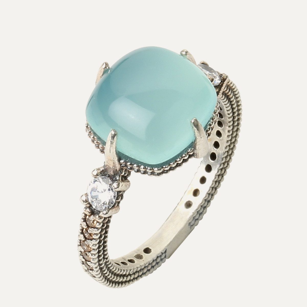 Anillo de plata oxidada 925 con acabado envejecido, cuixon de cuarzo en 3 colores a elegir, y circonitas.