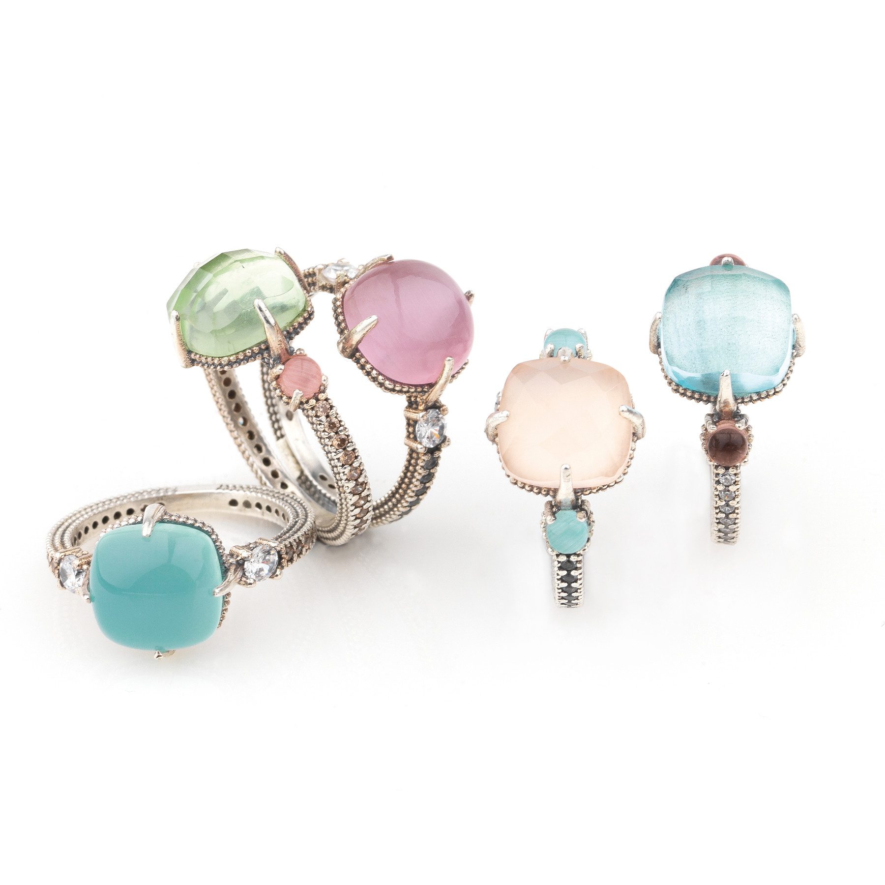Anillo de plata oxidada 925 con acabado envejecido, cuarzos y circonitas, en dos combinaciones de colores a elegir.