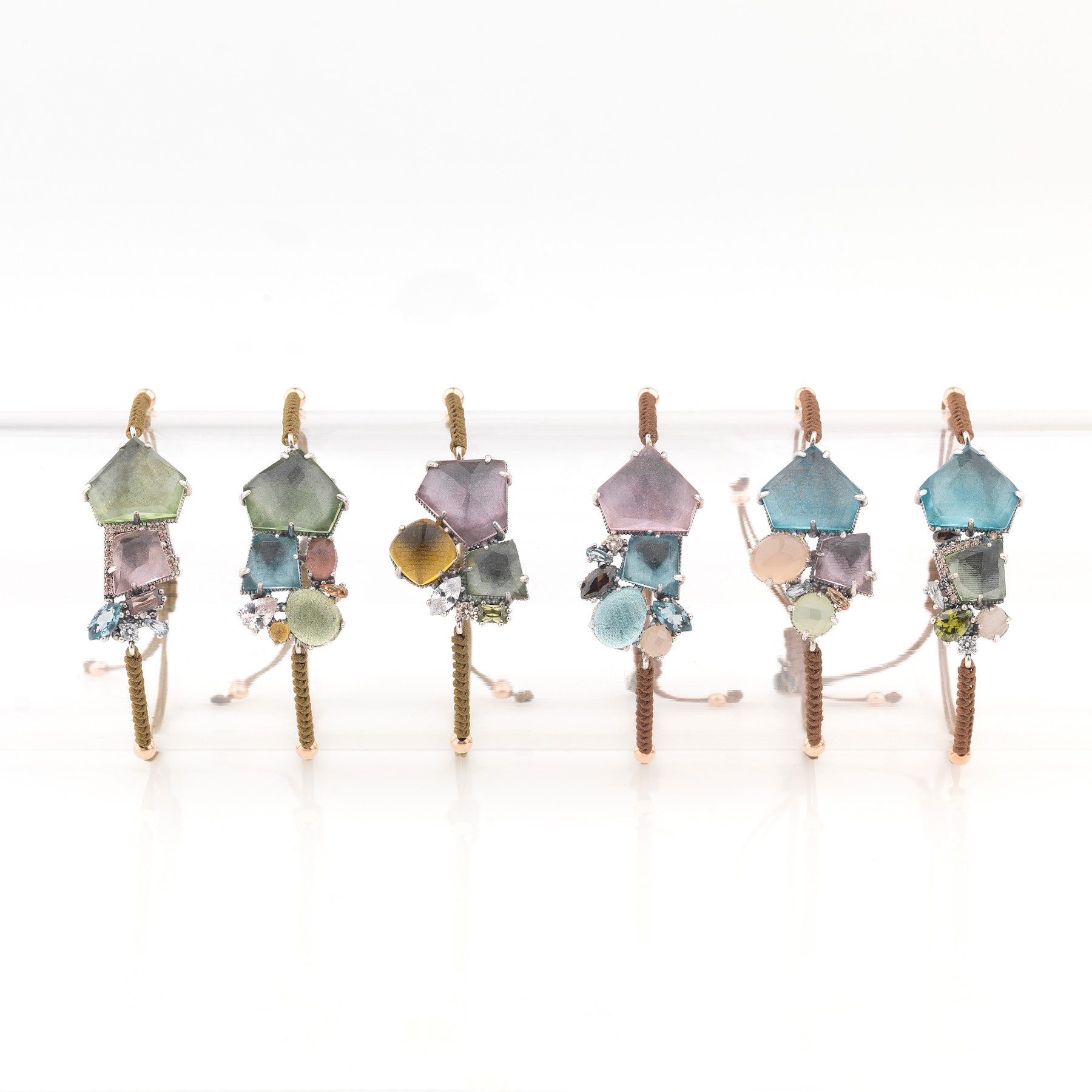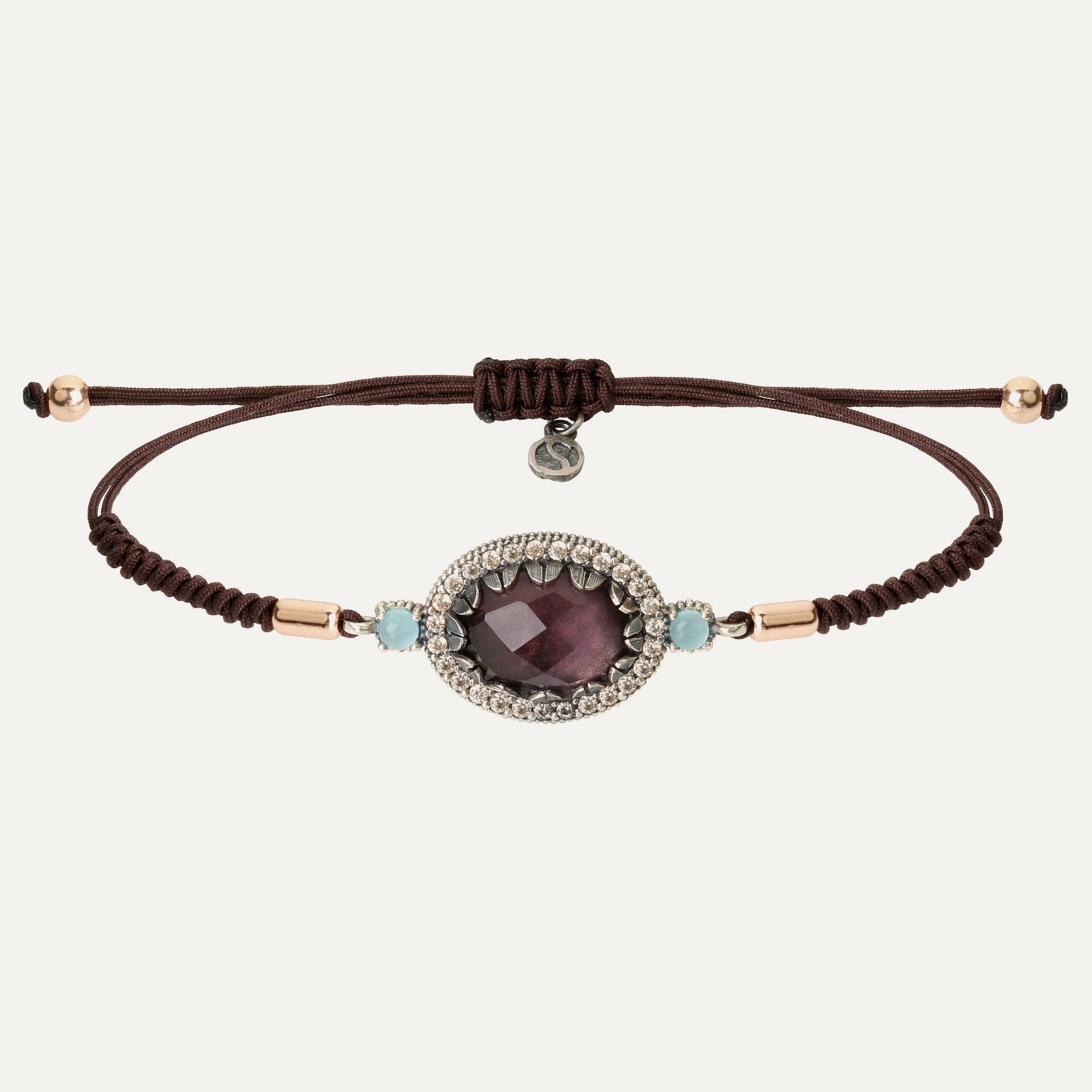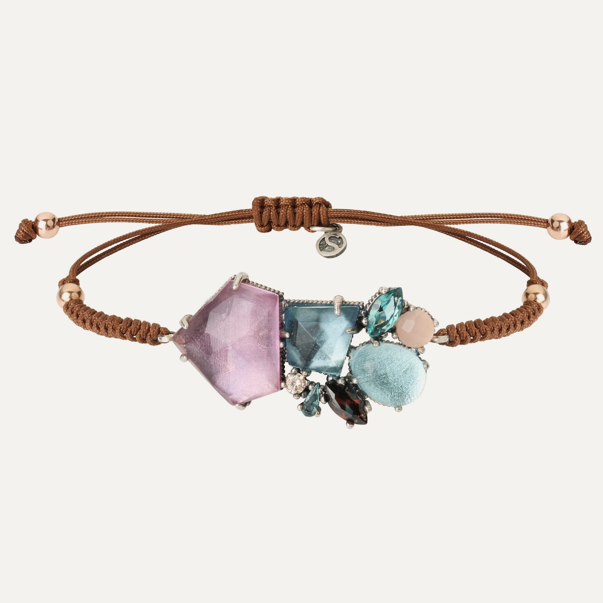 Pulsera de plata de ley 925, cuarzos de colores (rosa, violeta y aguamarina), circonitas y nylon.
