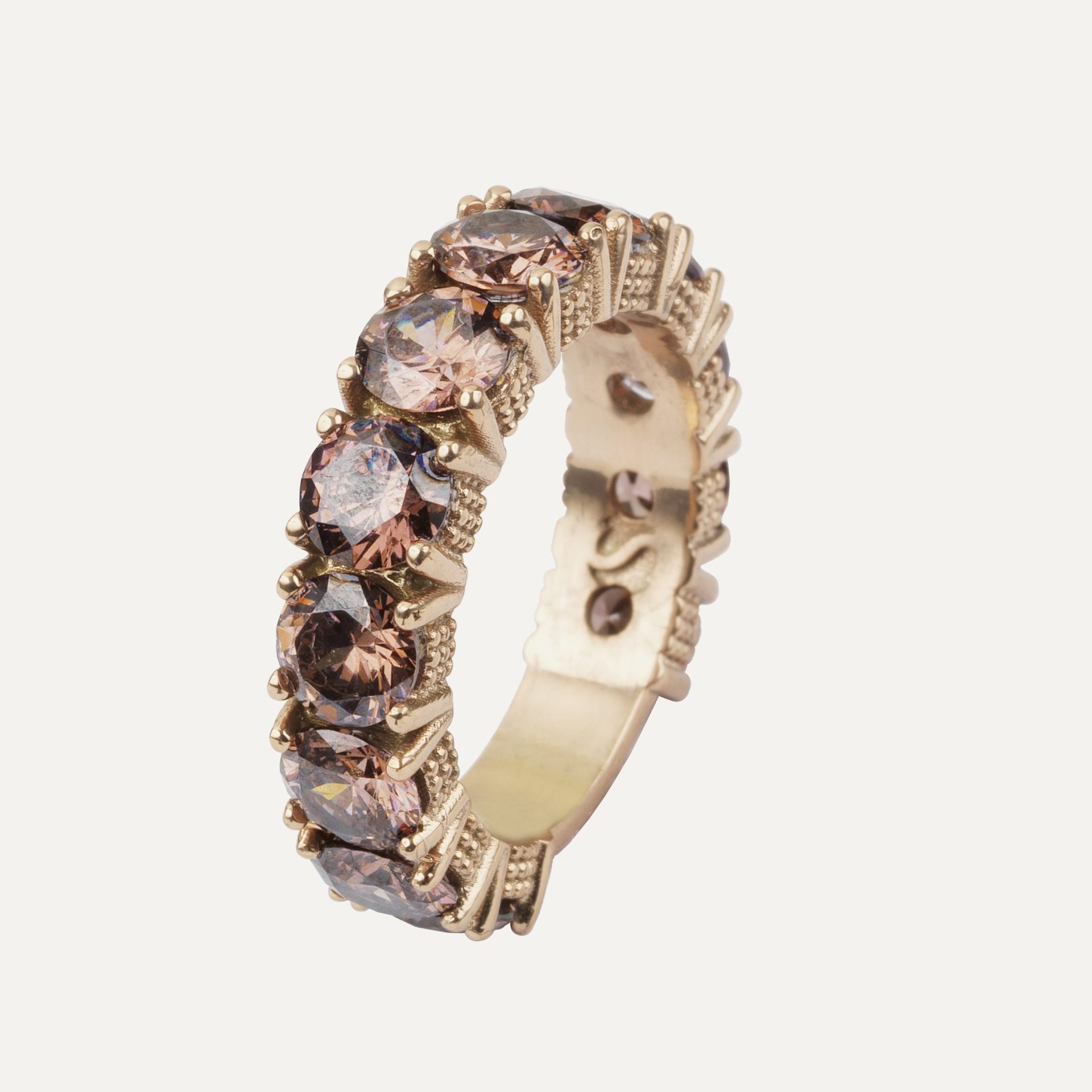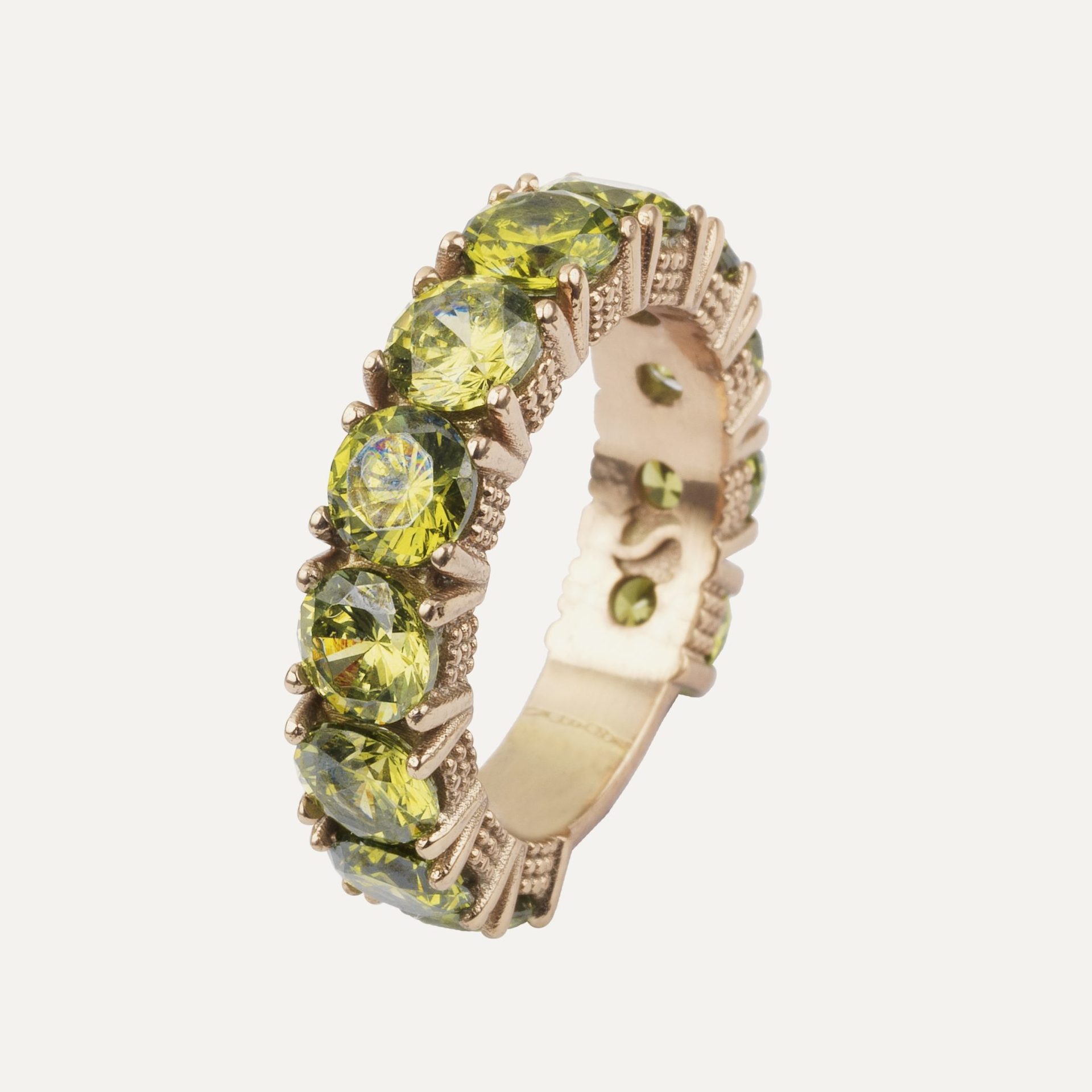 Anillo de plata de ley 925 bañado en oro rosa de 24 kt En el centro lo corona un cabujón cushion liso de peridoto de 10×8 mm. acompañado de cuatro cabujones cushion lisos de turmalina rosa de 4×4 mm.