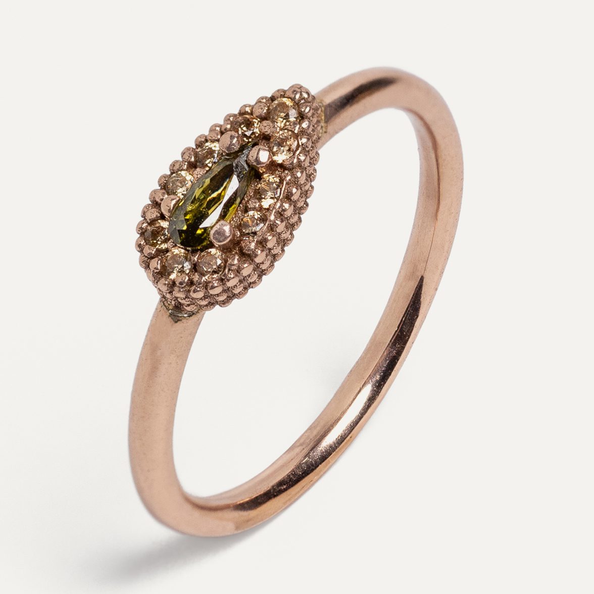 Espectacular anillo fabricado en plata de ley 925 con acabado envejecido. Destaca su cabujón facetado central en calcedonia o turmalina rosa de 15×19 mm. y el precioso grabado combinado con circonitas talla brillante.