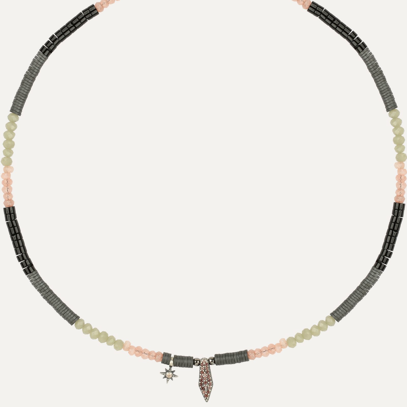 En la parte superior, una circonita en tono menta talla marquise, un cabujón liso en turmalina rosa y dos circonitas en románticos tonos rosados rematan un diseño en forma de flechas de circonitas bancas y verdiazuladas en talla brillante y clavadas a mano sobre plata de ley, que ya fue un éxito en la línea de colgantes Aura, de la pasada colección Silence Speaks.