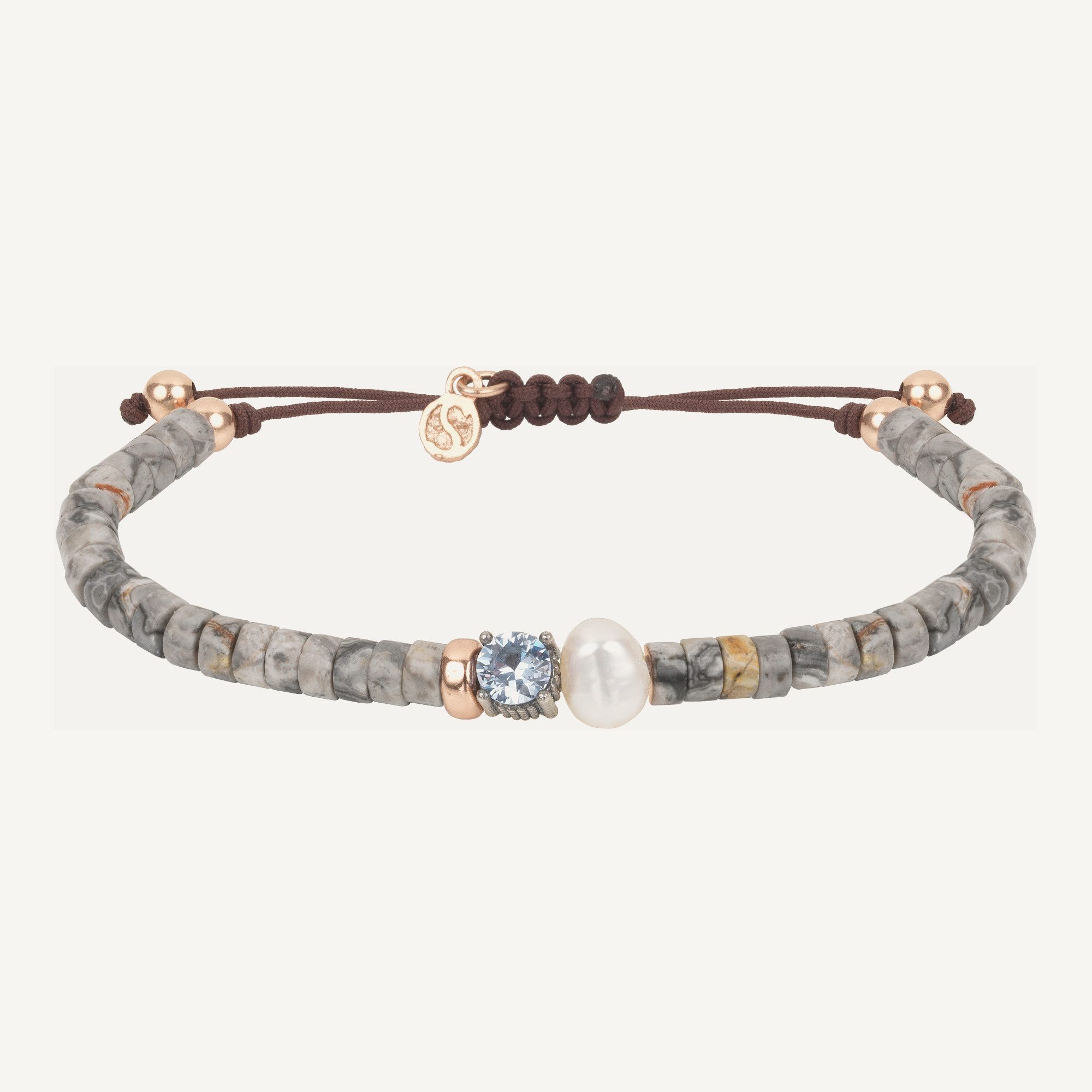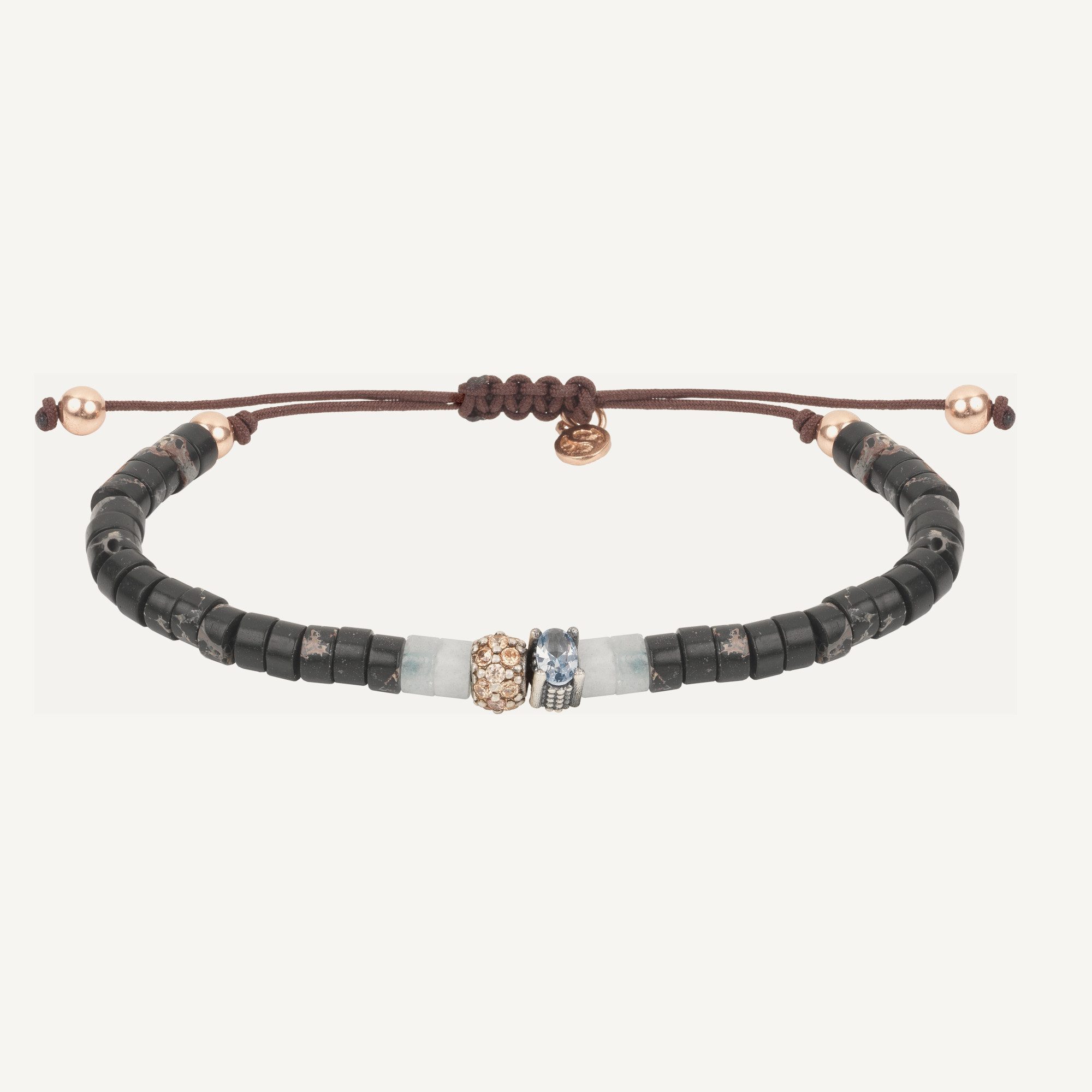 Este colgante de la colección Formentera de Sunfield está hecho con plata de ley 925, jaspe negro y hematites. Destaca como motivo principal una perla esférica acompañando a un llamativo cabujón calcedonia facetado con seis circonitas blancas talla brillante, detalles en plata chapada en oro rosa de 24 kt todo montado sobre acero negro.