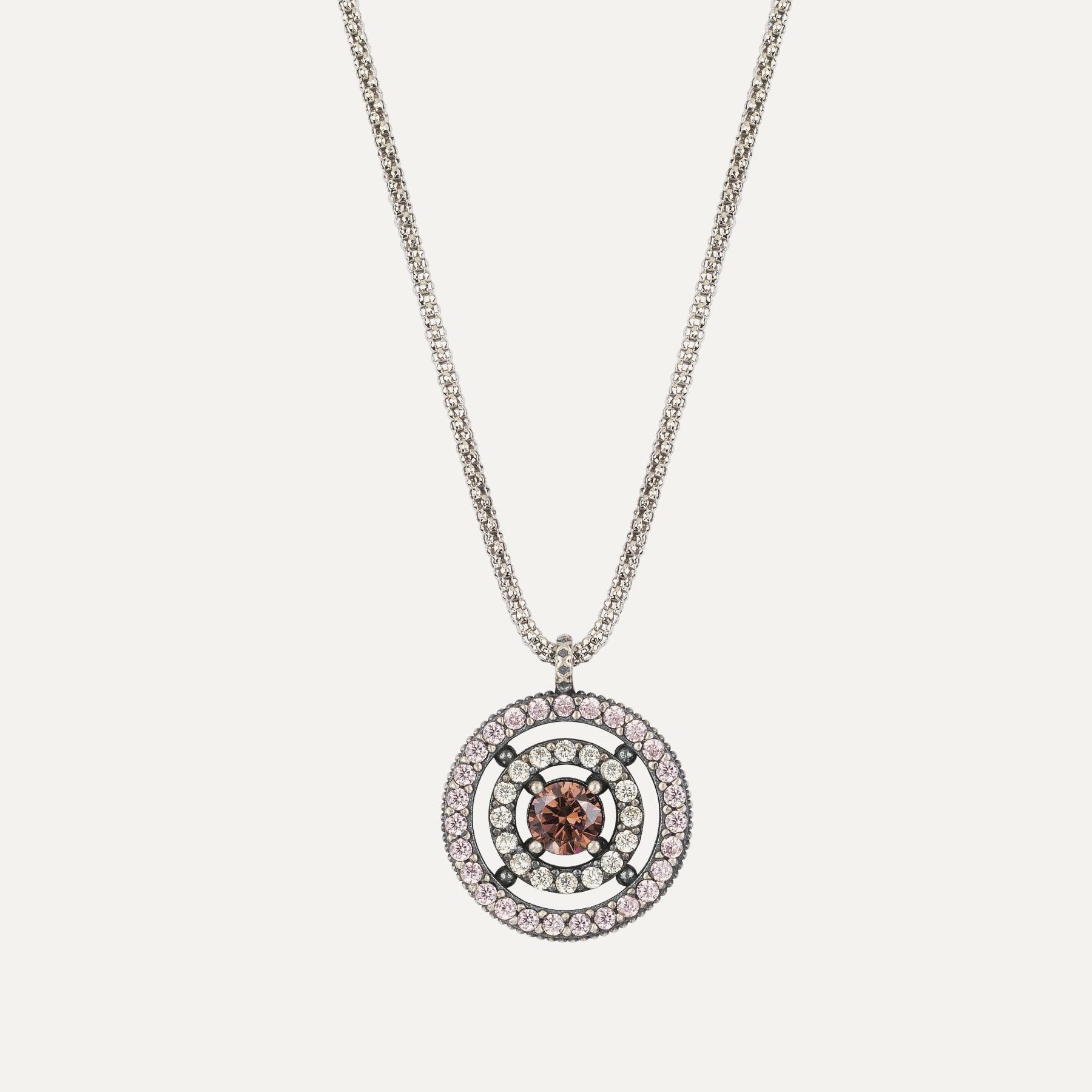 Los colgantes París de Sunfield son delicados, equilibrados y con algo en su diseño que los hace poco comunes y originales. Es de plata de ley 925 y consta de una circonita central de 5 mm de diámetro color brown talla brillante del que cuelga un pedazo de cadena con un motivo floral con circonitas peridoto talla brillante. La cadena es de 41 cm de largo.