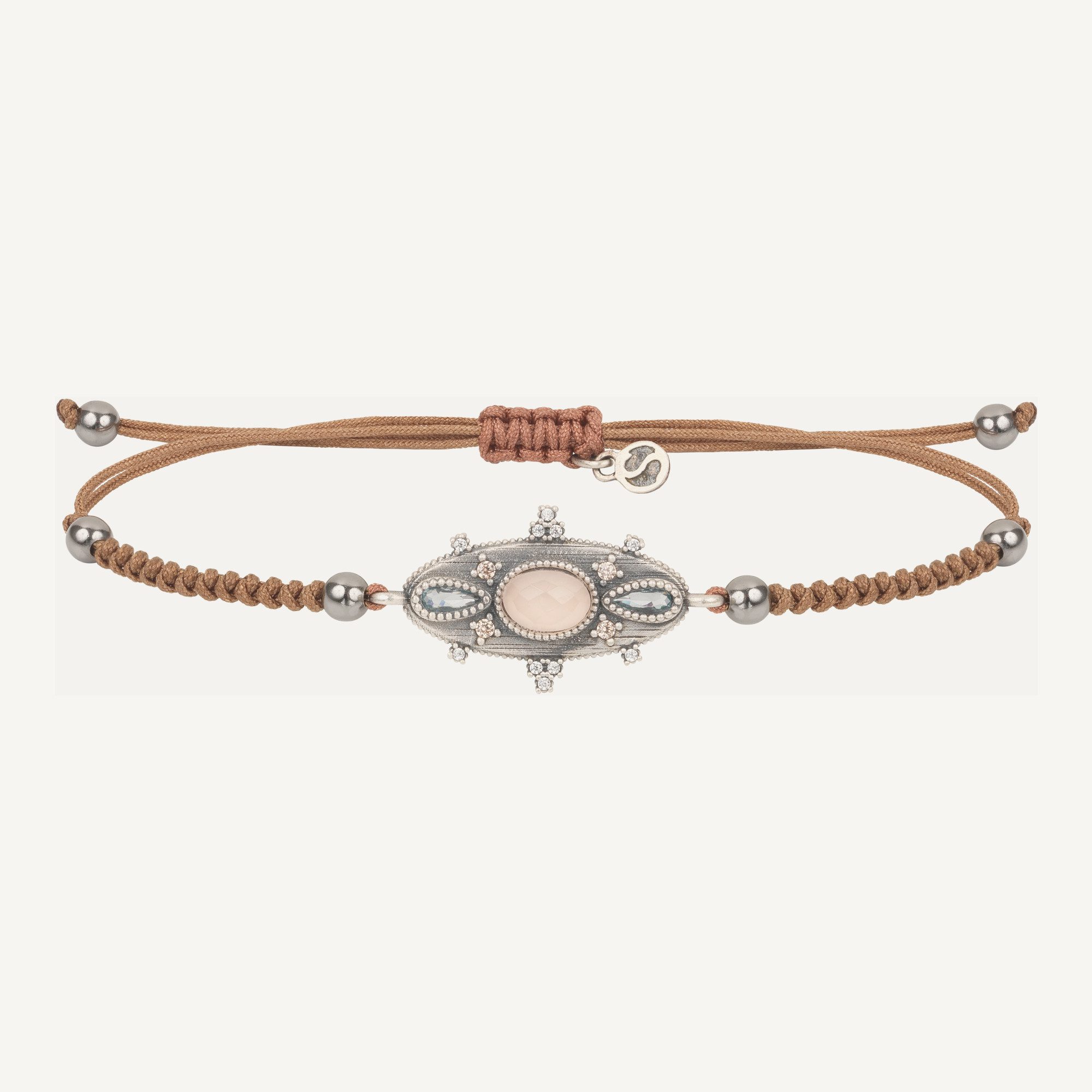 Los colgantes Pigalle de Sunfield son equilibrados, con un toque romántico incluso étnico, una combinación diferente y original. Fabricado en plata de ley 925 con un cabujón facetado central de 5 mm de diámetro de cuarzo rosa acompañado de un cabujón liso de 3 mm de diámetro de símil ópalo azul y circonitas color champagne y brown. Cadena de 42 cm de longitud.