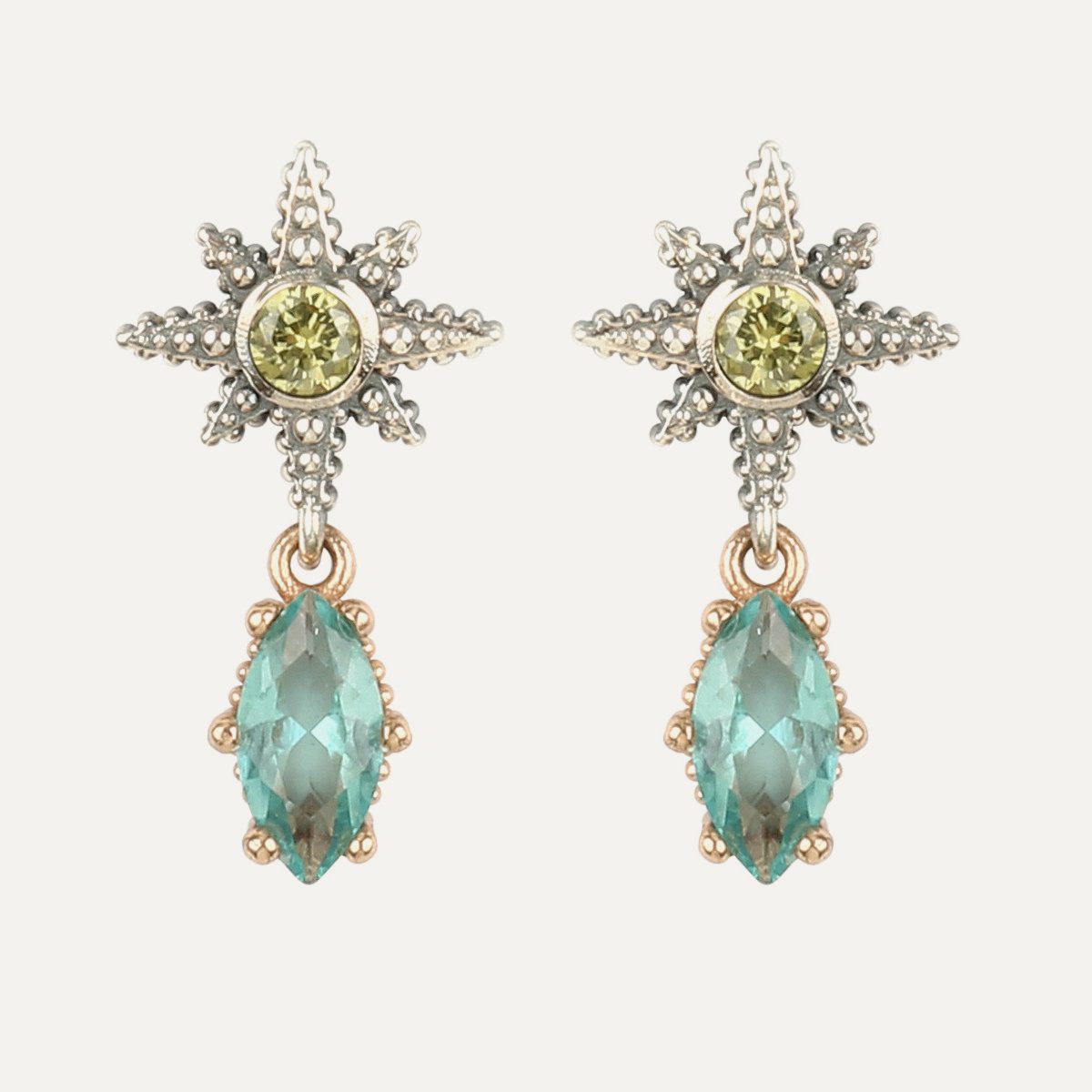 Se trata de unos pendientes con movimiento, donde la parte inferior está realizada en plata de ley con acabado envejecido, un cabujón facetado de 1cm de largo y forma ovalada, rodeado de circonitas en talla brillante. La parte superior se compone de cuatro cabujones lisos en una combinación de dos colores.