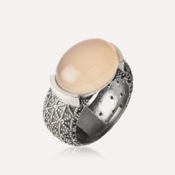 Los pendientes Pavlova de Sunfield hacen juego con los colgantes y pulseras con el mismo nombre. Están fabricados en plata de ley 925 con acabado envejecido y hacen 23 mm de largo. En la parte superior luce un cabujón facetado de 5 mm de diámetro de calcedonia del que cuelga una medalla de plata con un cabujón oval central de 8×10 mm de cuarzo rosa acompañado de dos circonitas champagne talla brillante.