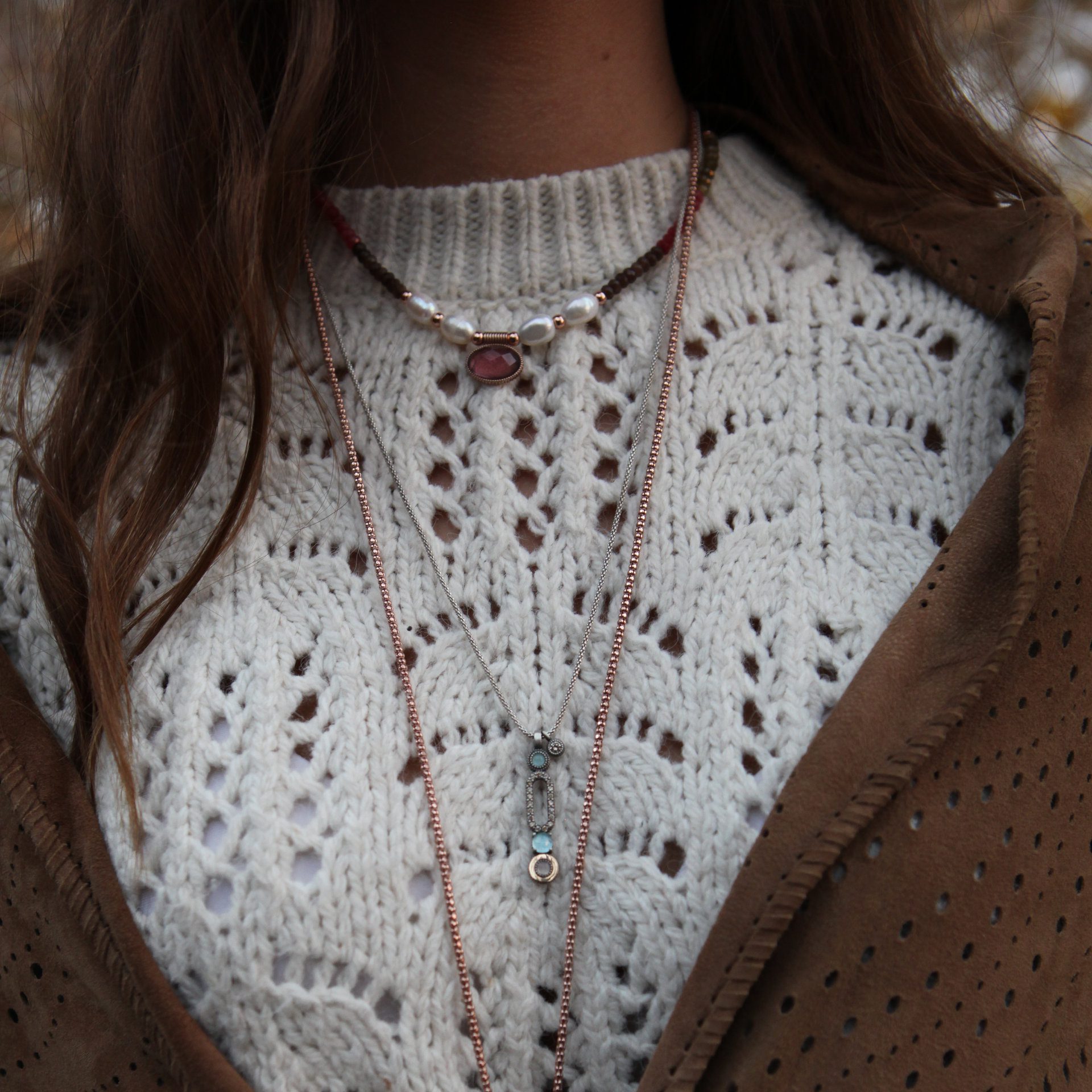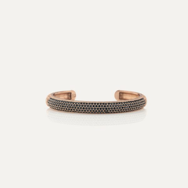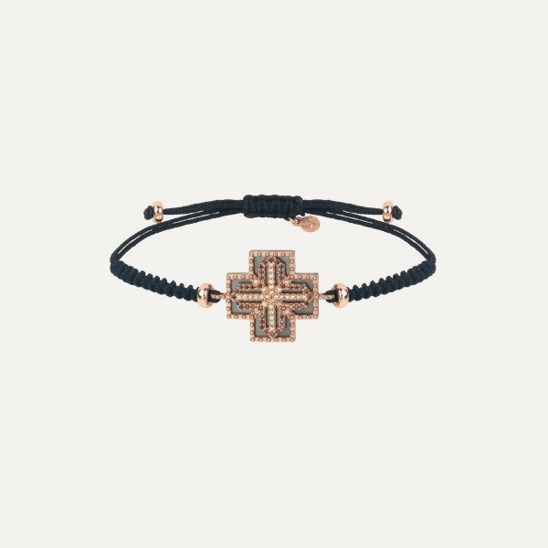 Las pulseras Tamariu de Sunfield juega con las simetrías de sus formas y combina elegantemente diferentes tonos y texturas. Está montada con un resistente hilo de nailon negro y la componen un motivo central hexagonal de plata rodiada en negro y bañada en oro rosa de 24 kt de 17×17 mm adornado con circonitas champagne talla brillante. Es de medida ajustable.
