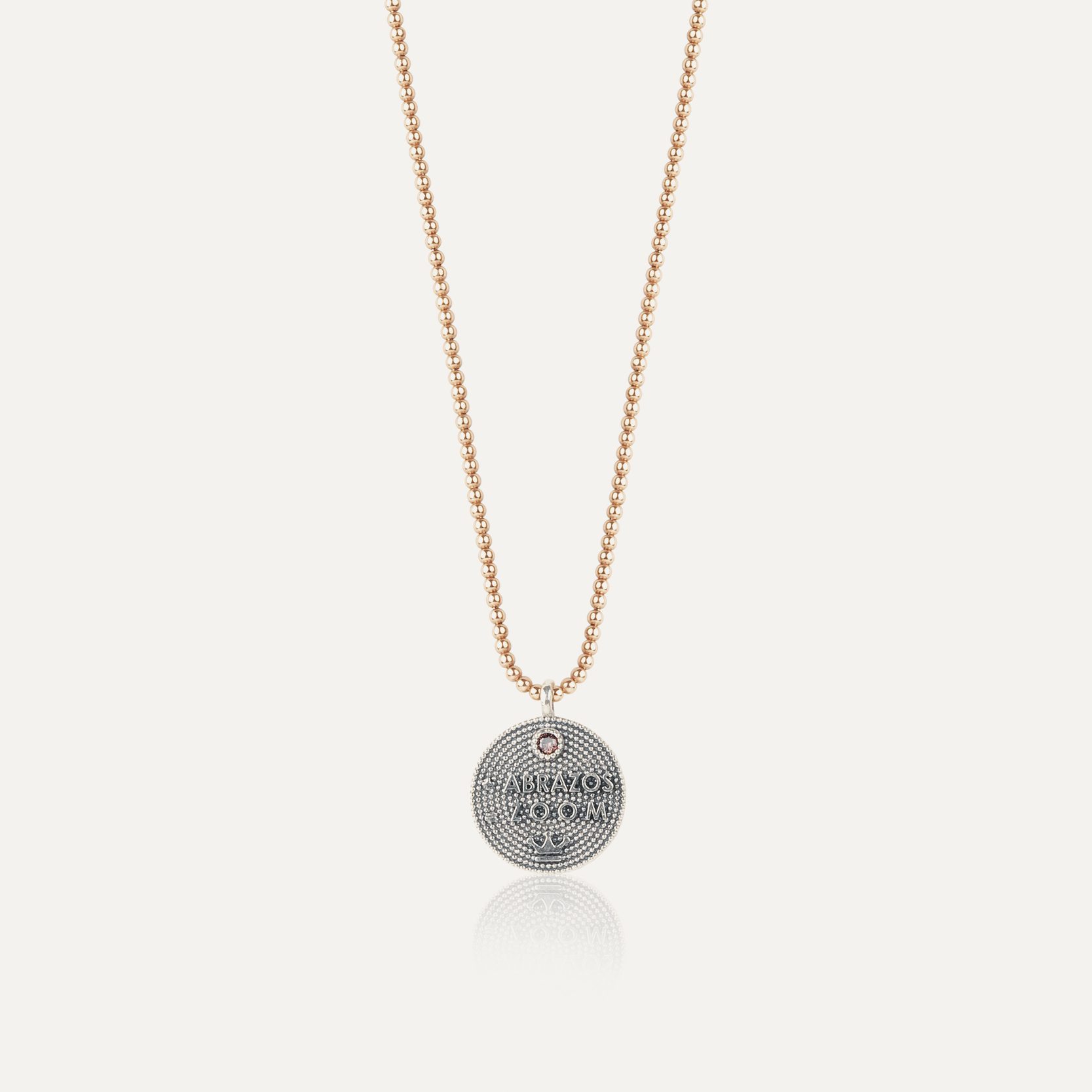 Colgante de plata de ley 925 con baño de oro rosa de 24 kt, decorado con granate, peridoto, cuarzo fumé y cuarzo rosa. Un diseño circular de inspir...